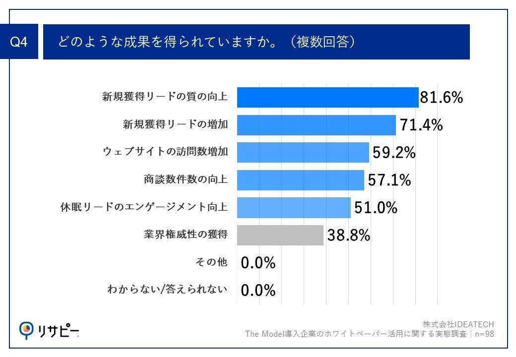 Q2で「非常に感じている」「やや感じている」と回答した方に、「Q4.どのような成果を得られていますか。(複数回答)」(n=98)と質問したところ、「新規獲得リードの質の向上」が81.6%、「新規獲得リードの増加」が71.4%、「ウェブサイトの訪問数増加」が59.2%という回答となりました。