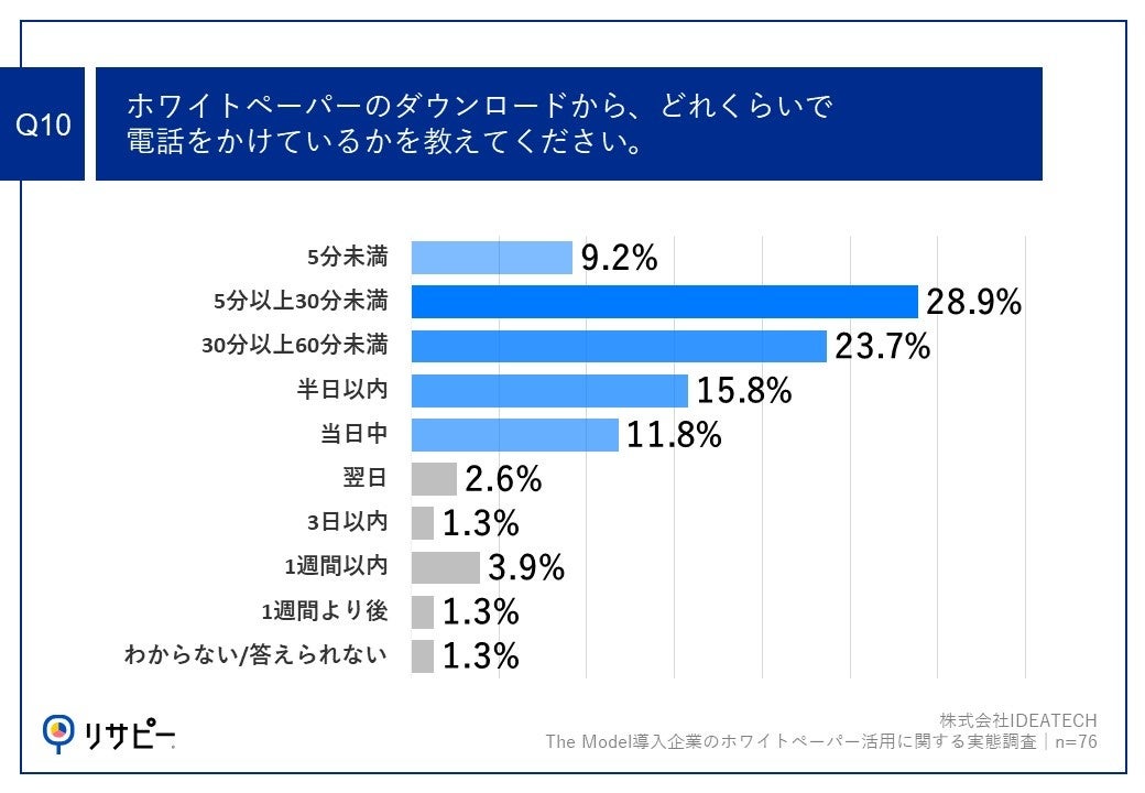 Q9で「電話」と回答した方に、「Q10.ホワイトペーパーのダウンロードから、どれくらいで電話をかけているかを教えてください。」(n=76)と質問したところ、「5分以上30分未満」が28.9%、「30分以上60分未満」が23.7%、「半日以内」が15.8%という回答となりました。