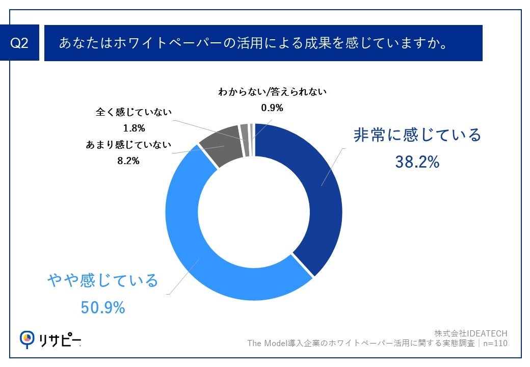 「Q2.あなたはホワイトペーパーの活用による成果を感じていますか。」(n=110)と質問したところ、「非常に感じている」が38.2%、「やや感じている」が50.9%という回答となりました。