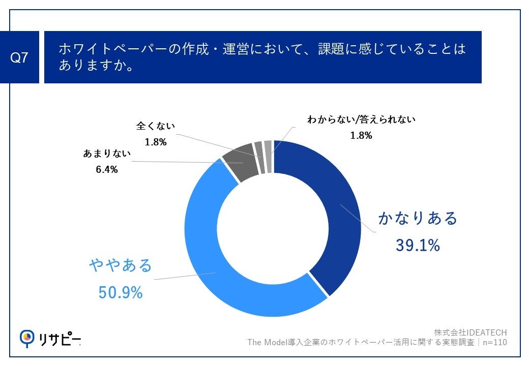 「Q7.ホワイトペーパーの作成・運営において、課題に感じていることはありますか。」(n=110)と質問したところ、「かなりある」が39.1%、「ややある」が50.9%という回答となりました。