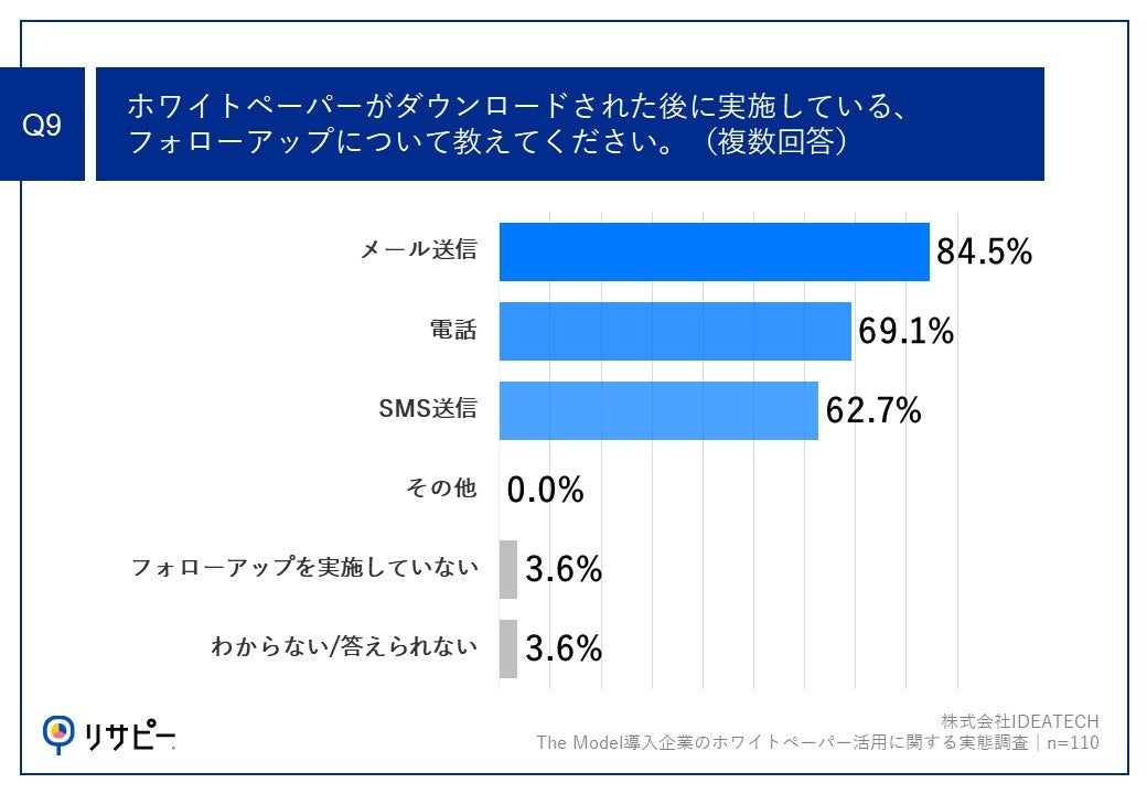 「Q9.ホワイトペーパーがダウンロードされた後に実施している、フォローアップについて教えてください。(複数回答)」(n=110)と質問したところ、「メール送信」が84.5%、「電話」が69.1%、「SMS送信」が62.7%という回答となりました。