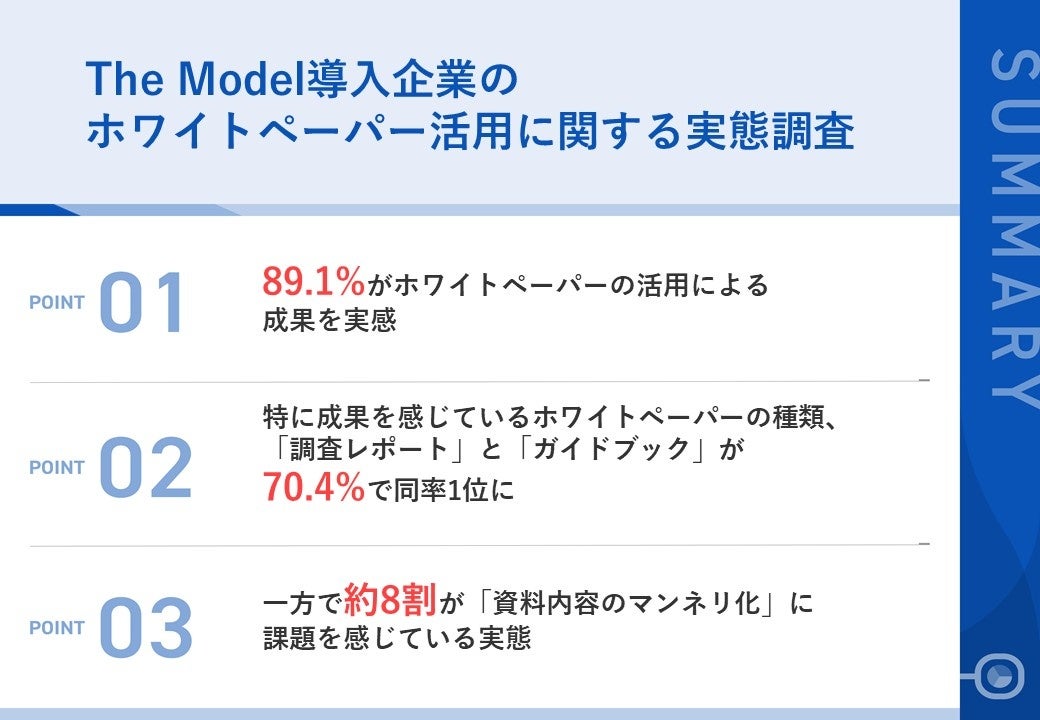 The Model型営業プロセスを導入する企業の約9割が、「ホワイトペーパー」活用による成果を実感!約7割は「調査レポート」をコンテンツとして活用