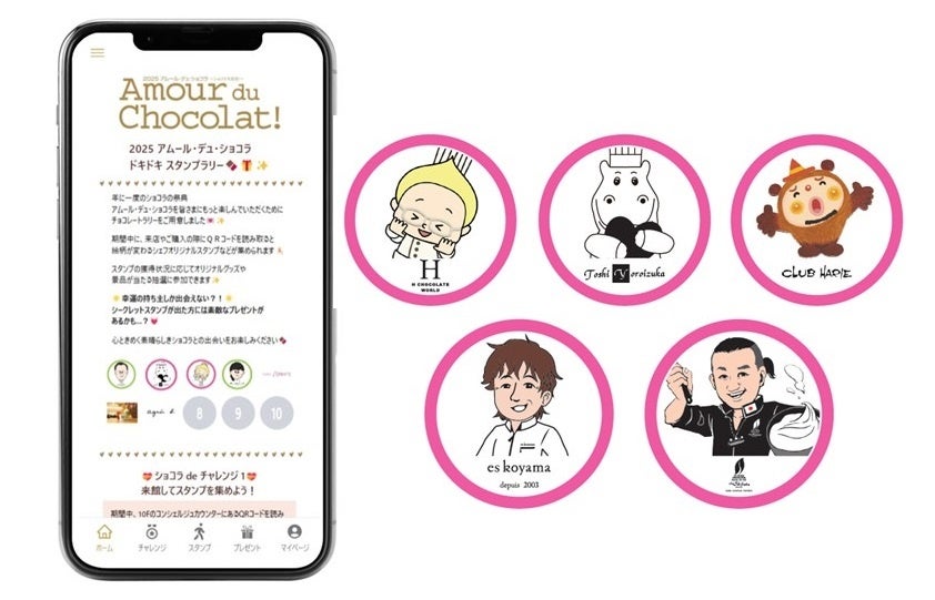 新設するアムールデジタルスタンプラリーのLINEアカウントからスマートフォンで参加いただけるスタンプラリー。アムール会場への来場やご購入、百貨店館内への回遊など様々なミッションをクリアすると、オリジナルイラストで制作したシェフ(45名)のスタンプがランダムで獲得できます。スタンプの獲得数に応じて抽選でオリジナルグッズも当たります。