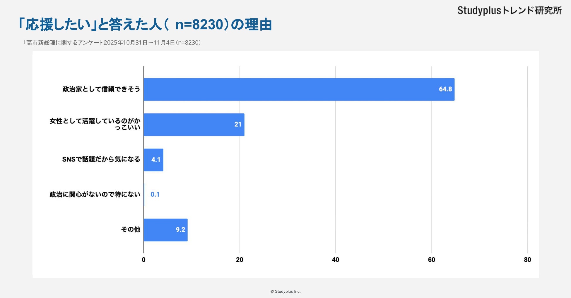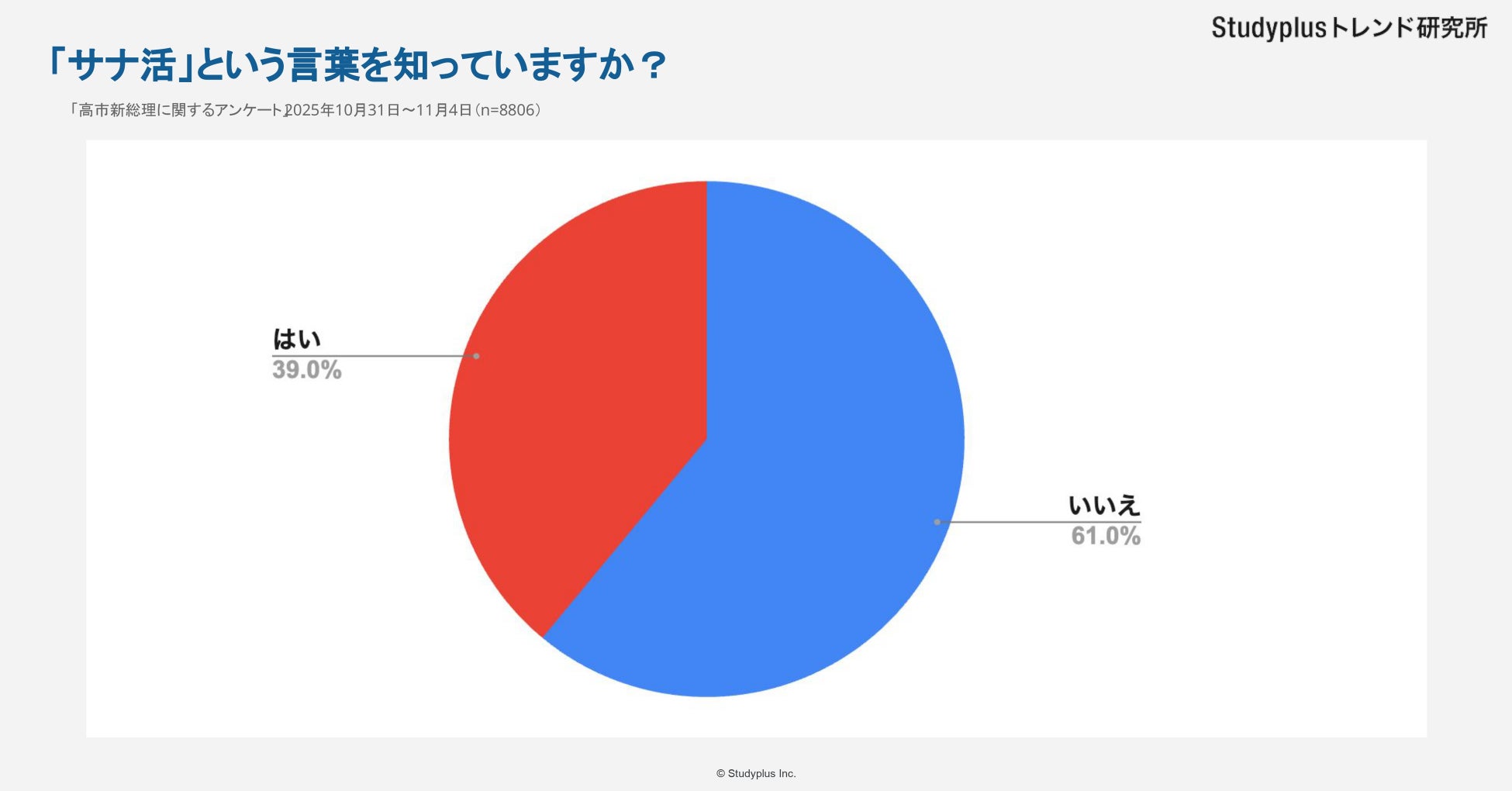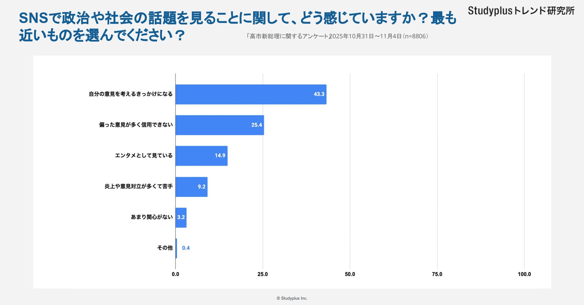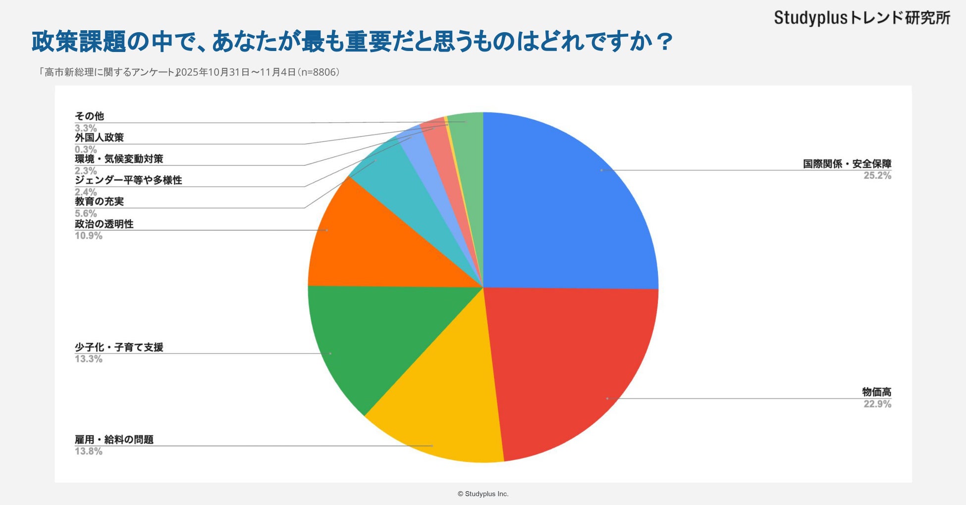 スタディプラス株式会社(本社:東京都千代田区、代表取締役:廣瀬高志、以下スタディプラス)のStudyplusトレンド研究所は、2025年10月31日(金)から11月4日(火)にかけて学習管理アプリ「Studyplus」上で全国の高校生と大学生を対象に「高市新総理に関するアンケート」を実施、8,806