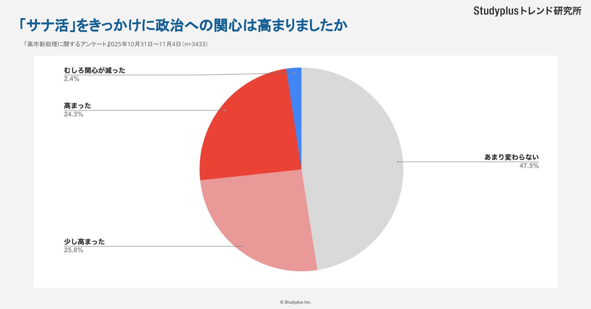 また、「サナ活」がきっかけで政治への関心が高まったかどうかについては、「あまり変わらない」が47.5%、「少し高まった」が25.8%、「高まった」が24.3%となりました。