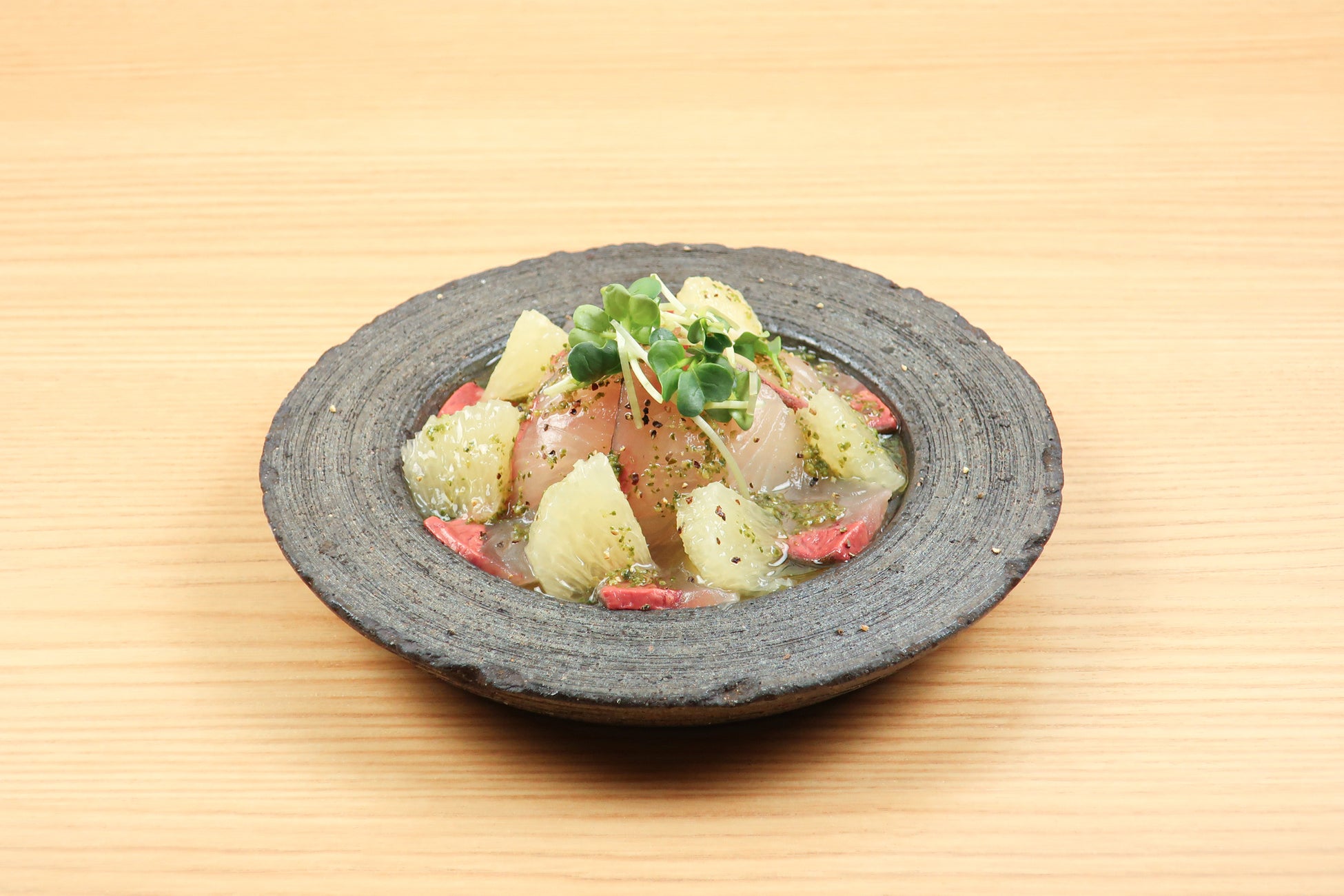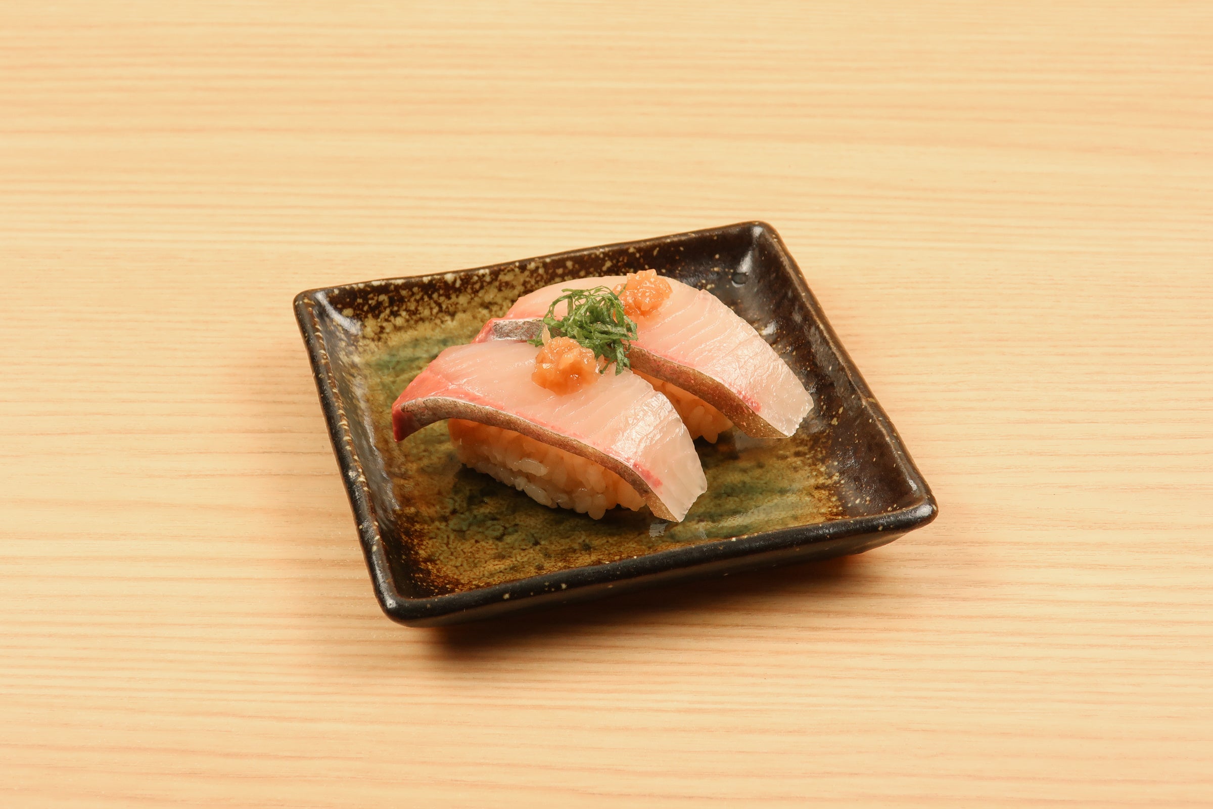 カンパチは、甘みがあり引き締まった身が自慢で、鮮度にこだわり、生のまま皮付きで納品しています。店内で皮引きから行うことで、皮と身の間の味が濃厚な部分を新鮮な状態で、ご提供しています。大葉・梅肉でさっぱり味わえるにぎりやグレープフルーツのさっぱり感とバジルオイルがよく絡む、一品などをご用意しております。