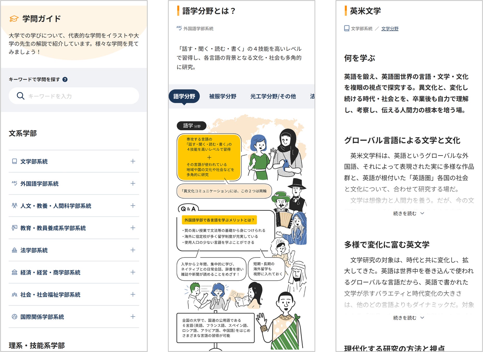 大学で学ぶことができる学問分野について、様々な大学の専門の先生による解説やイラストでわかりやすく紹介するコンテンツです。18学部系統、66分野、代表的な約90学科の情報を網羅しており、各学問がどのような学びで、社会とどう繋がっているのかを直感的に理解することができます。