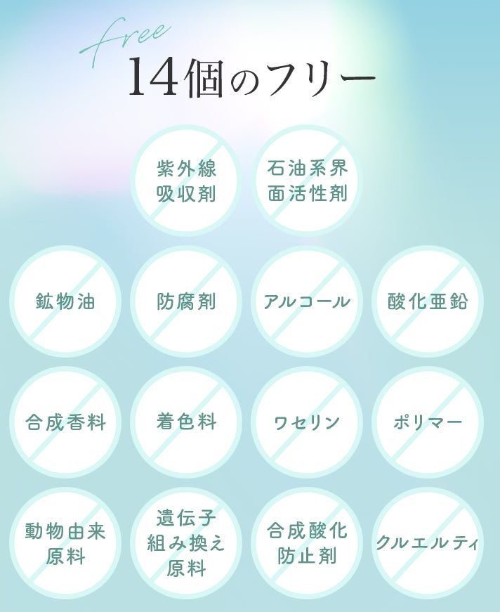 肌刺激の可能性がある成分を極限まで排除し、14個のフリーを叶えた肌にやさしい処方です。0歳*のお子さんから敏感肌、アレルギー肌の方まで使用できるよう、肌へのやさしさを第一に考えました。