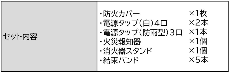 ①防火カバー、電源タップ、火災報知器、消火器スタンド、結束バンドがセットになった充実の内容