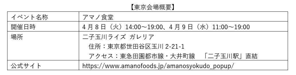 「アマノ食堂」はアマノフーズが展開している本年10周年を迎えるWEBマガジンで、日々の自炊に役立つ食材の豆知識や料理家のレシピをお届けしています。その「アマノ食堂」が期間限定でポップアップイベントを開催し、一瞬で「つくりたて」の美味しさを楽しめるアマノフーズのフリーズドライ食品を提供します。「アマノ食堂」ではアマノフーズらしいおもてなしで、仕事や家事、育児などで忙しい毎日を過ごす人たちに、ゆとり時間を生み出す “おいしい休息”を体験いただけます。