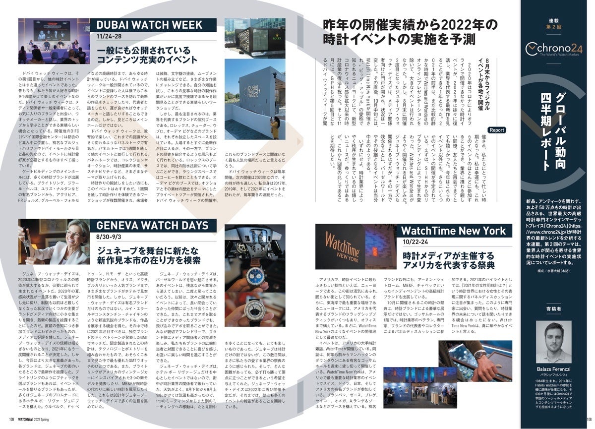 時計写真の作品連載「ファインダー越しの小宇宙」、ヒコ・みづのの学生の1年に密着した「目指せ未来の独立時計師」、女性向け腕時計の最新事情がわかる「レディスウオッチ通信」、世界最大のオンライン時計マーケットChrono24による業界動向レポートほか、人気連載ももちろん掲載中!