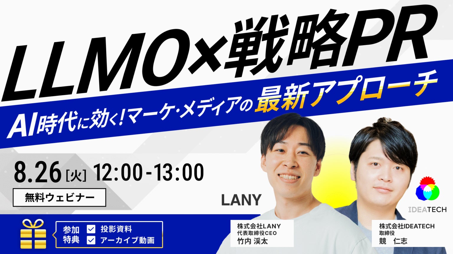 【無料共催ウェビナー】LLMO×戦略PR|AI時代に効く!マーケ・メディアの最新アプローチ(LANY×IDEATECH)を8/26(火)に開催