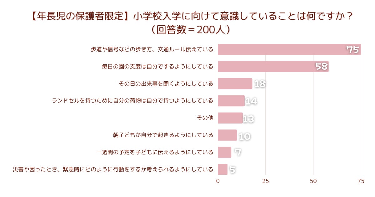 【調査結果】【年長児の保護者限定】小学校入学に向けて意識していることは何ですか?1位は『歩道や信号などの歩き方、交通ルール伝えている』!