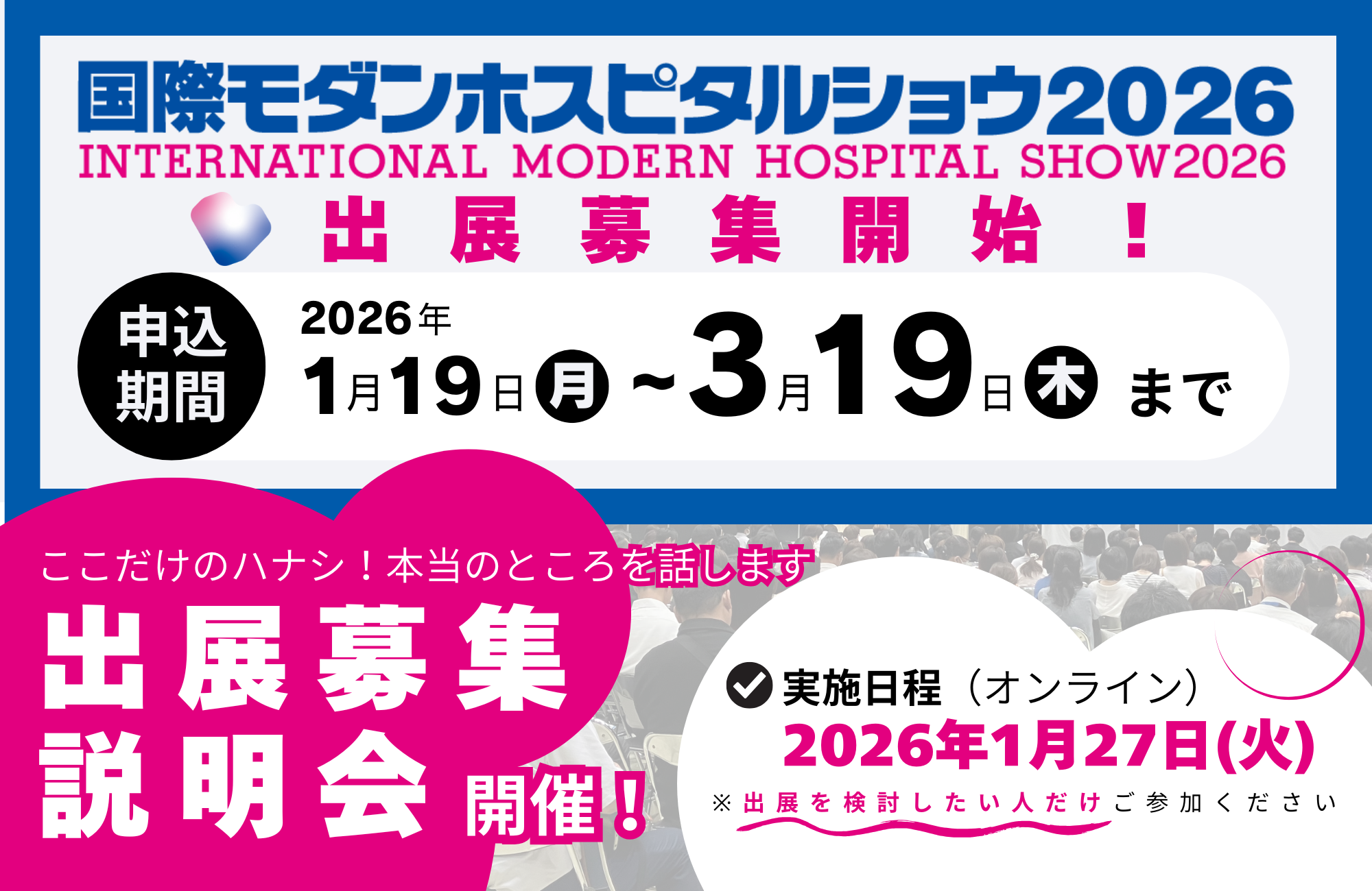 「国際モダンホスピタルショウ2026」の出展募集開始にあわせ、出展を検討されている企業・団体向けに、オンライン説明会を実施いたします。