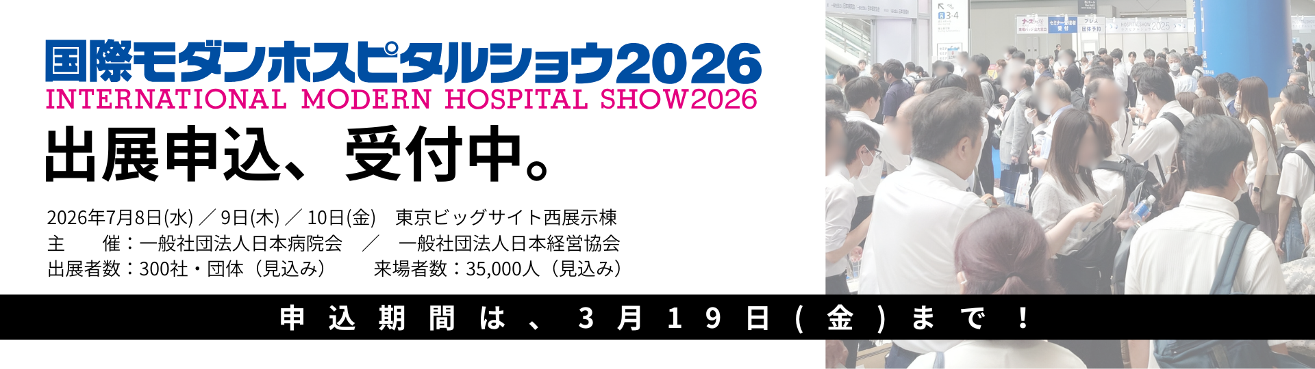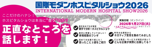 一般社団法人日本経営協会(本部事務局:東京都渋谷区、会長:高原 豪久)は、医療福祉分野の展示会「国際モダンホスピタルショウ2026」(2026年7月8日(水)~10日(金) 会場:東京ビッグサイト 主催:一般社団法人日本病院会、一般社団法人日本経営協会)の出展募集を、1月19日(月)より開始いたしました。