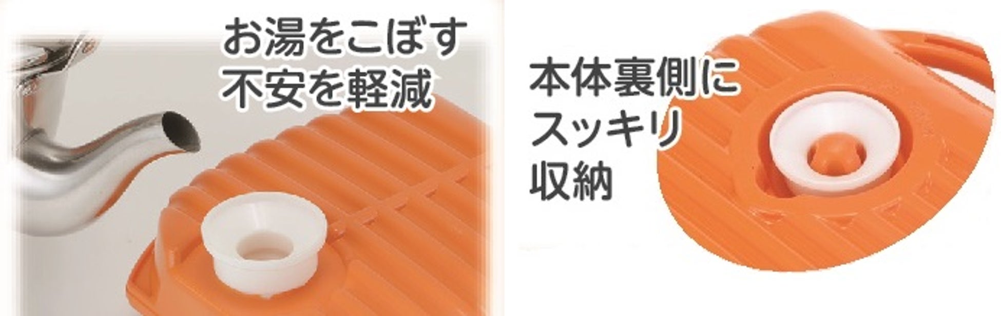 湯たんぽで不便な点として、お湯を注ぐ際にこぼしてしまうことや、それによるやけどの心配が挙げられます。本製品にはじょうごがついており、お湯を簡単に注ぐことが可能になっています。その為、熱湯による火傷の心配がなく、安心・安全に使用できます。