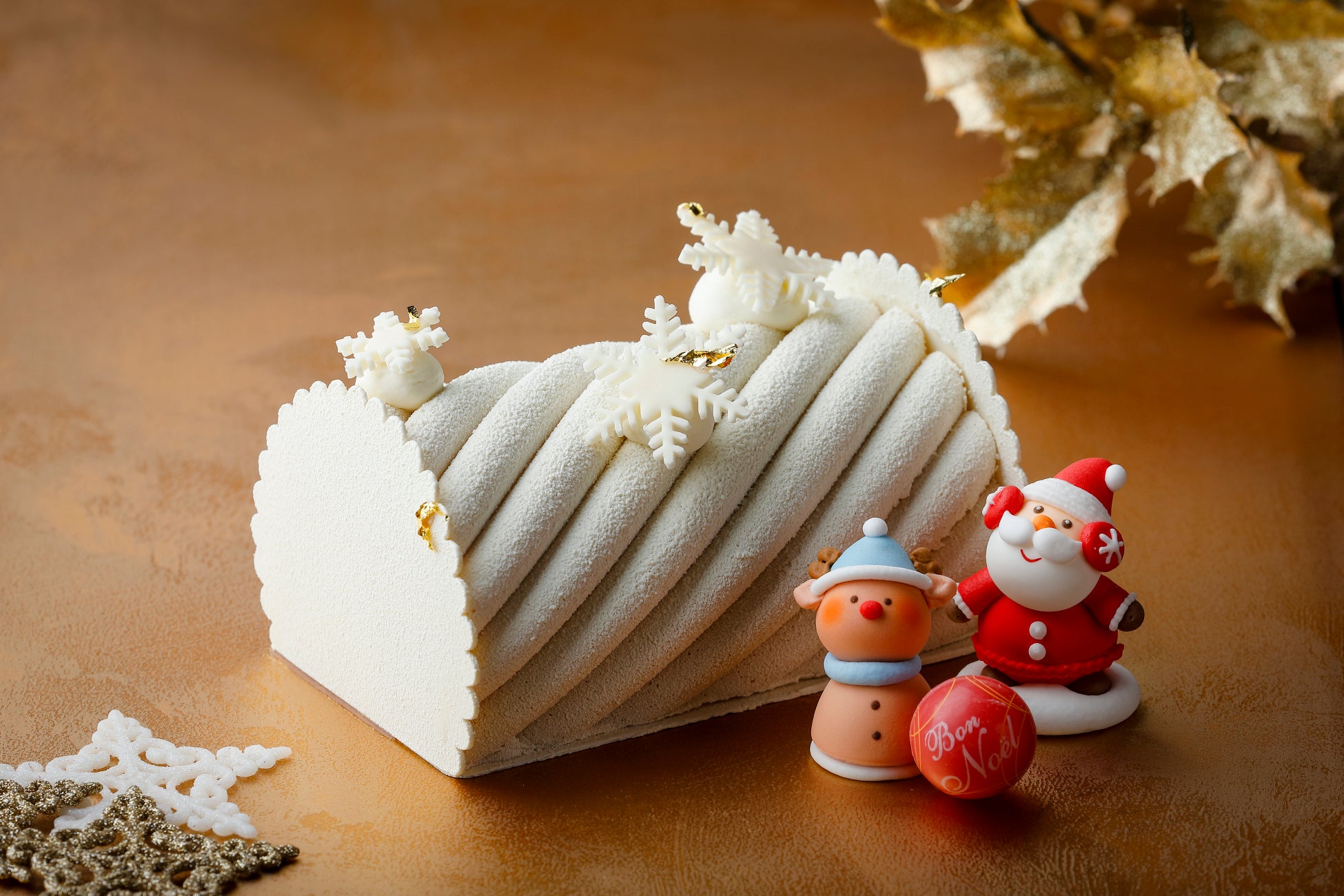 ホワイトクリスマスをイメージした、雪のようにやさしい口あたりの純白のブッシュ・ド・ノエル。ブロンドチョコレート「ヴァローナ・デュルセ」を使ったクリーミーなムースの中に、シナモンブリュレ、オレンジガナッシュ、アーモンドクランブルを忍ばせ、味わいに奥行きをもたせました。フランスの伝統菓子に、現代的な感性を添えた一品です。