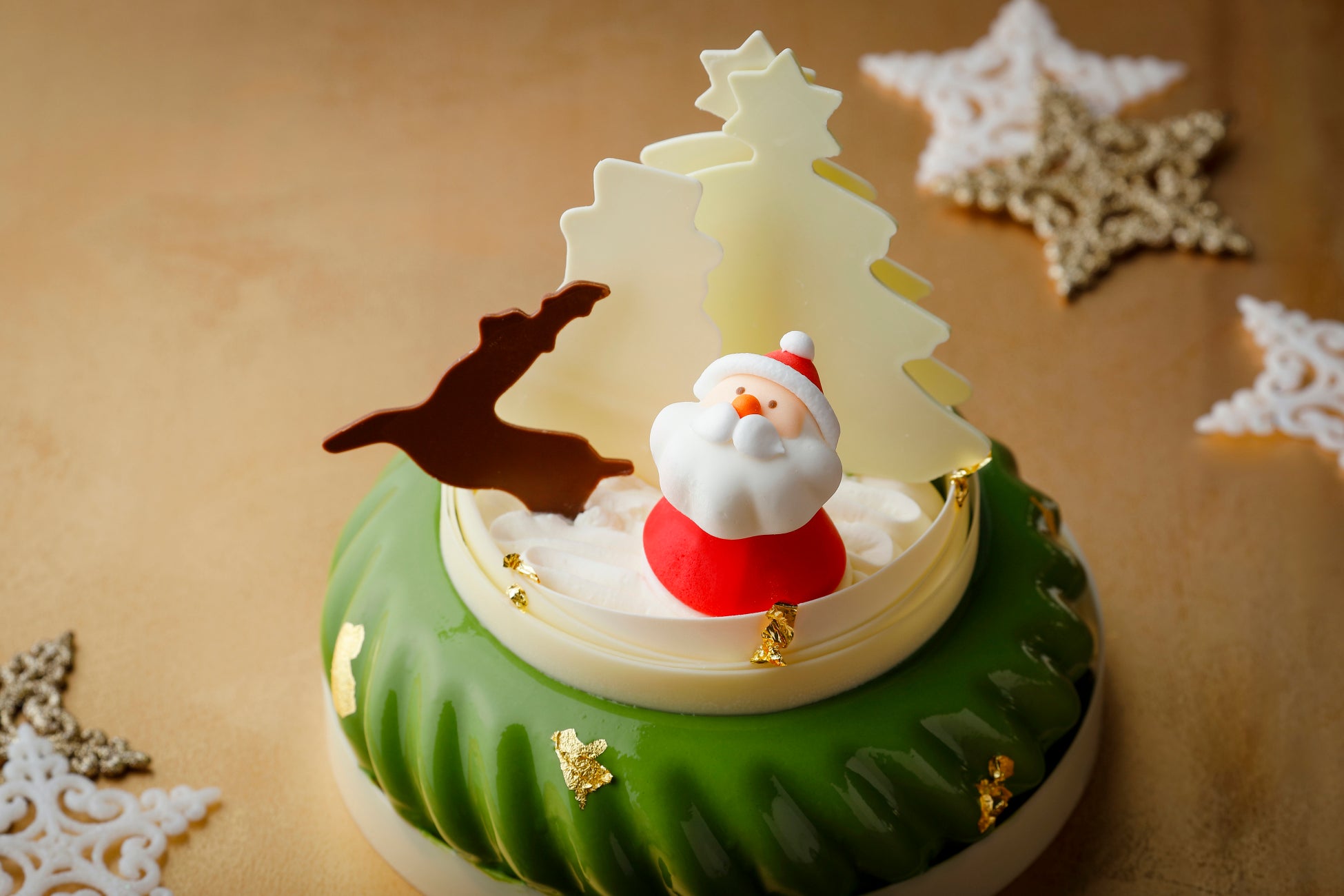 クリスマスツリーにサンタクロースやトナカイが飾られ、クリスマスの一幕のような華やかで遊び心あふれるケーキ。ピスタチオを主役に、ブラッドオレンジやワインガナッシュ、チョコレートの香りが織り成す豊かな味わいで、祝祭ムードにぴったりの一品。