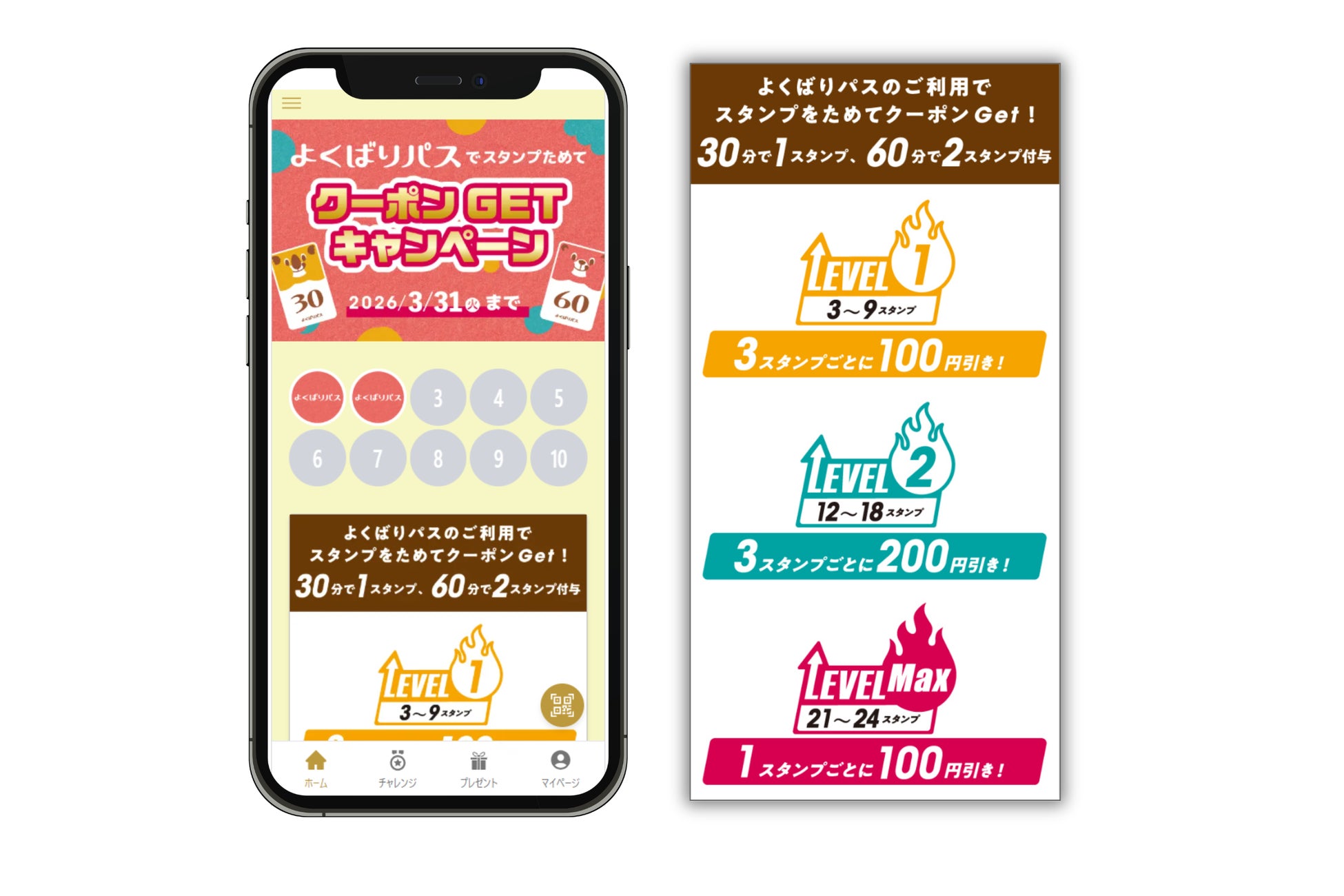 「よくばりパス(30分)」購入でスタンプを1つ付与、「よくぱりパス(60分)」の購入でスタンプが2つ付与されます。スタンプを集めた個数に応じてお得なクーポンをプレゼントします。