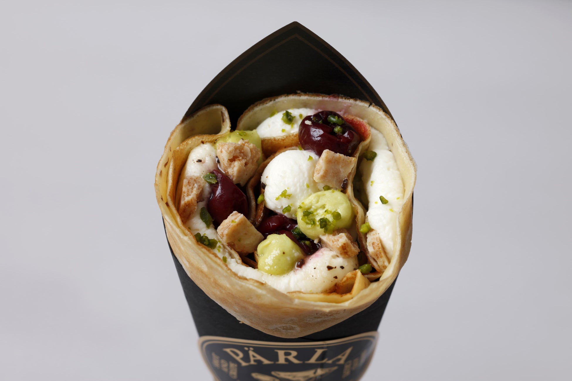 ピスタチオとマスカルポーネチーズのクリームに甘酸っぱいグリオットチェリーを合わせました。ホワイトチョコクランチが食感のアクセントになっています。緑と赤のコントラストが美しいクレープです。