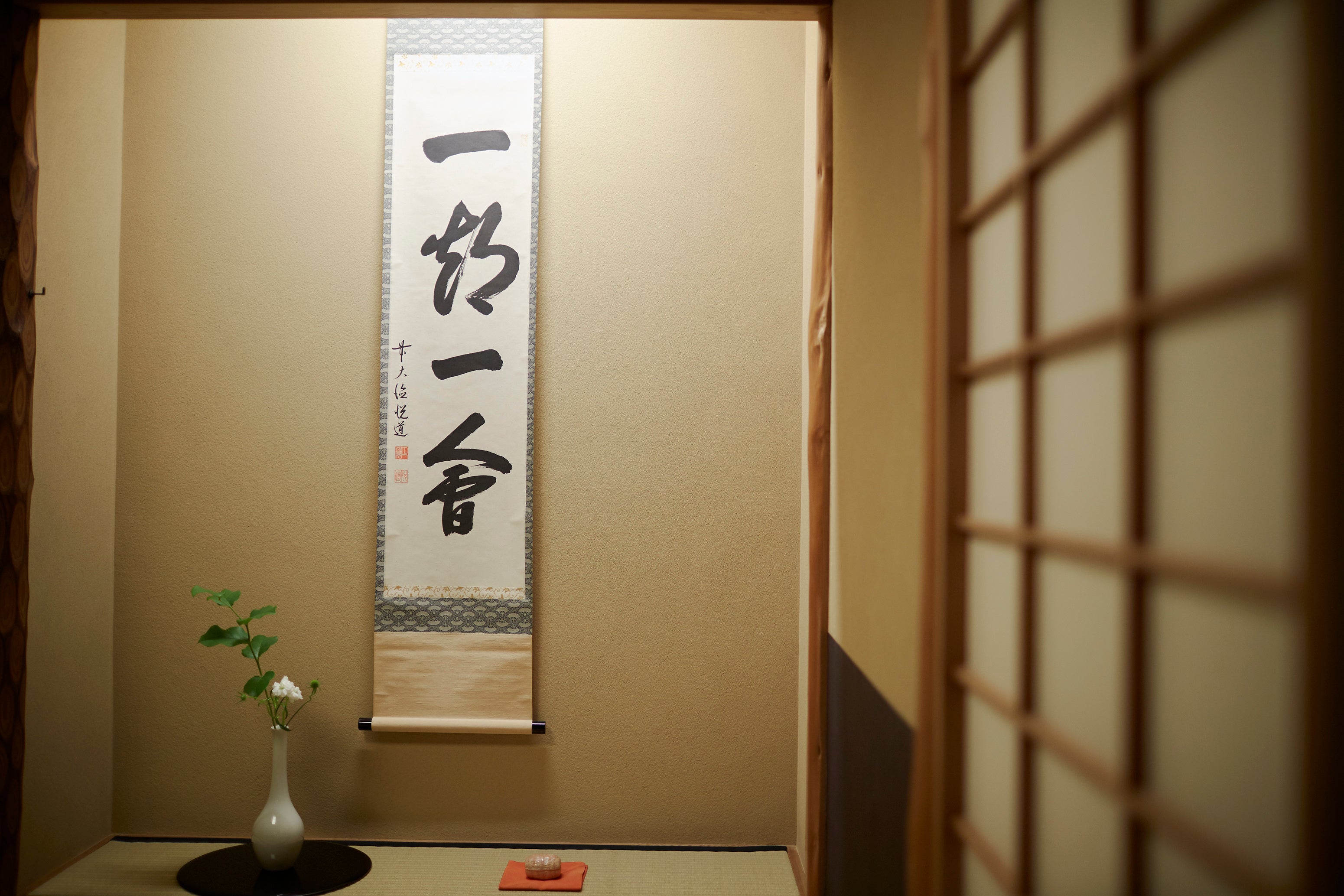 茶道の解説とお点前の実演後、お客様には抹茶と和菓子をお召し上がりいただきます。蹲(つくばい)でのお清めや、にじり口から茶室(小間)へ席入りする作法、床の間の掛け軸の説明を交えた、抹茶と和菓子を楽しむプログラムです。五感を研ぎ澄まし禅の境地を味わいながら、一期一会の精神と日本の伝統的なおもてなしに触れていただけます。