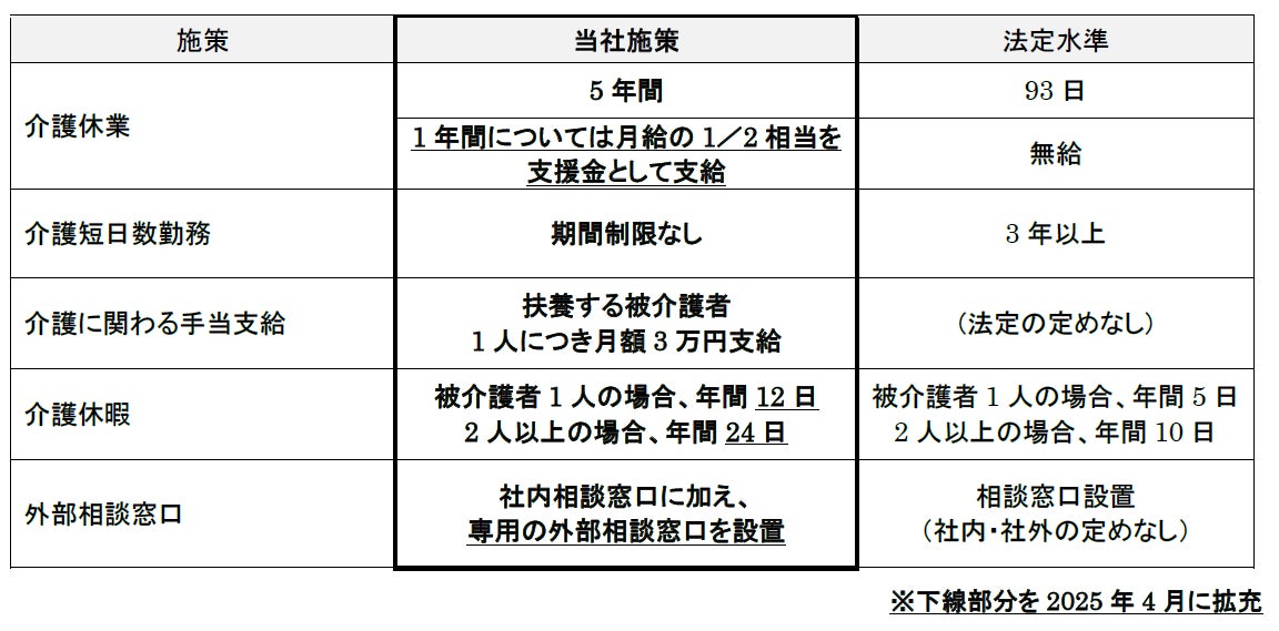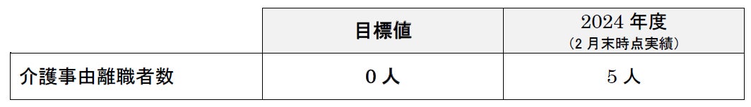 2024年度において、当社が把握している介護を事由とした退職者は5人ですが、介護を行っていることを会社に告げていない「隠れ介護者」を含めると、数に現れない相当数の方が介護を事由に退職されていると捉えています。上記の支援施策を含め、介護支援に対する施策をより一層推進していくことにより、「介護離職ゼロ」を目指します。