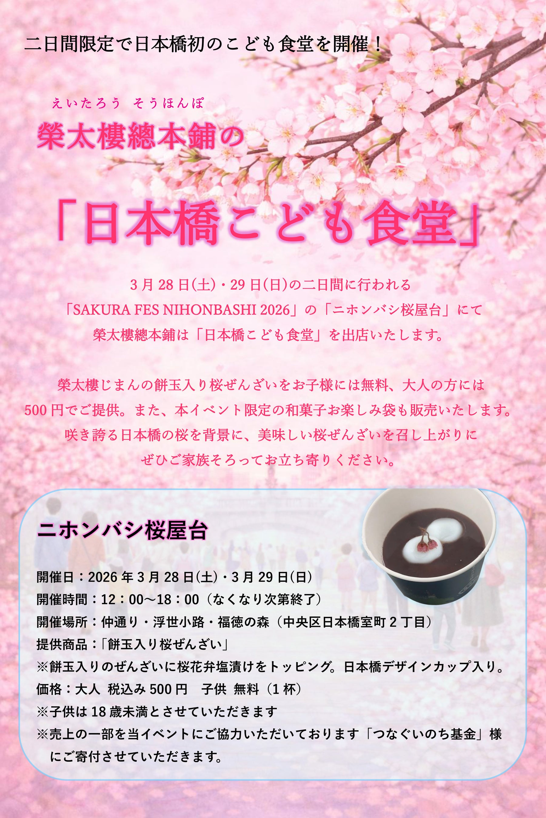 3月28日・29日に開催される「ニホンバシ桜屋台」にて、「日本橋こども食堂」を二日間限定で出店。お子様には無料、大人の方には税込500円で、餅玉入り桜ぜんざいをご提供いたします。