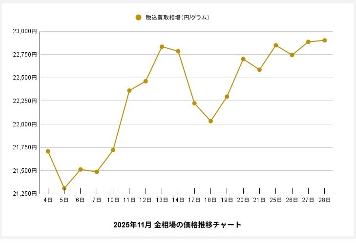 令和7年11月の金相場は1gあたり21,708円でスタート。9月から10月にかけて起きた金価格上昇ブームは下火となりつつありましたが、米政府機関閉鎖の長期化や利下げ政策の可能性が確実視されると金価格は再び高値を目指し始めます。11日に再び22,000円を突破。25日にはFRB理事のウォラー氏のコメントでも追加利下げの決定が正当化されることが述べられると市場の利下げ期待も上昇。米長短金利の低下は金価格の買い優先へと転じさせました。一時期は23,000円目前となりましたが、11月最終の28日は1gあたり22,902円としました。一方、銀相場は1ヶ月で30円の上昇。プラチナに続き資産としての割安感が買いの要因となっています。1年間でおよそ2倍以上にまで相場を伸ばしている銀相場はアクセサリー類や食器などの買取増加に大きく影響を及ぼしており、知る人ぞ知る金やプラチナに隠れた第三の資産として密かに注目を集めています。