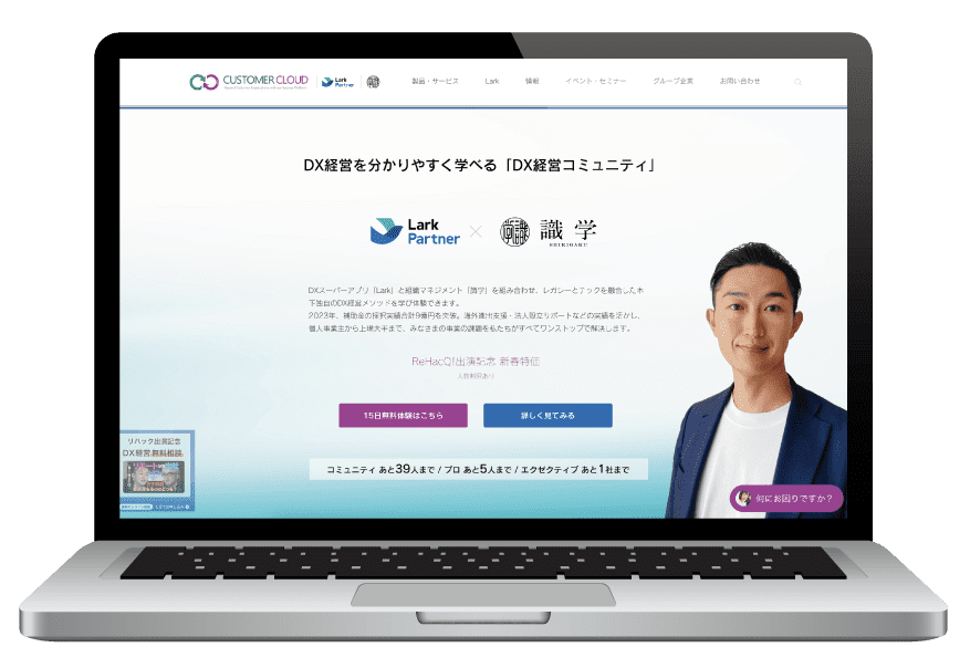 Lark公式パートナーおよび100万部(三部作)突破で話題の「識学」代理店として知られるカスタマークラウドは、独自のDX経営マネジメントメソッドで、経営課題の解決とDX変革をサポートしています。 |