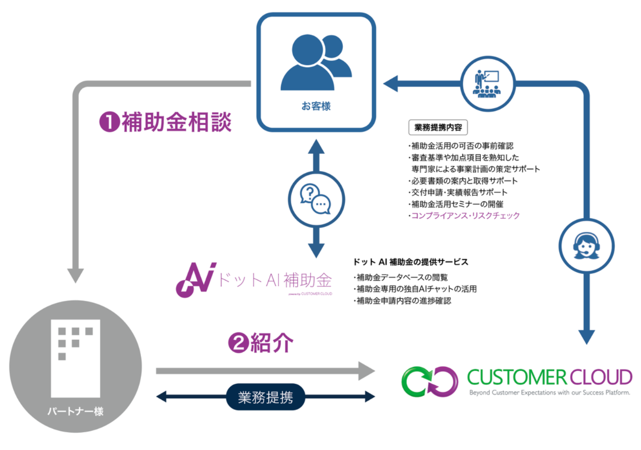 パートナー企業がお客様から補助金申請に関するご相談を承った際、お客様の同意を得てカスタマークラウドの専門家による申請支援サービスをご紹介いたします。