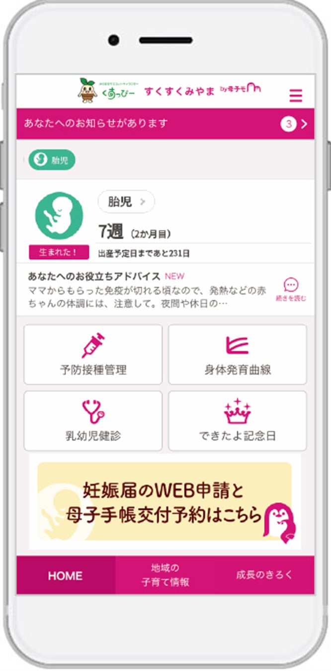 その施策のひとつとして2020年10月より母子手帳アプリ『母子モ』を導入し、『すくすくみやま』として提供しています。これにより、妊産婦と子どもの健康データの記録・管理や予防接種のスケジュール管理、出産育児に関するアドバイスや市が配信する地域情報の確認などがアプリから可能となっています。