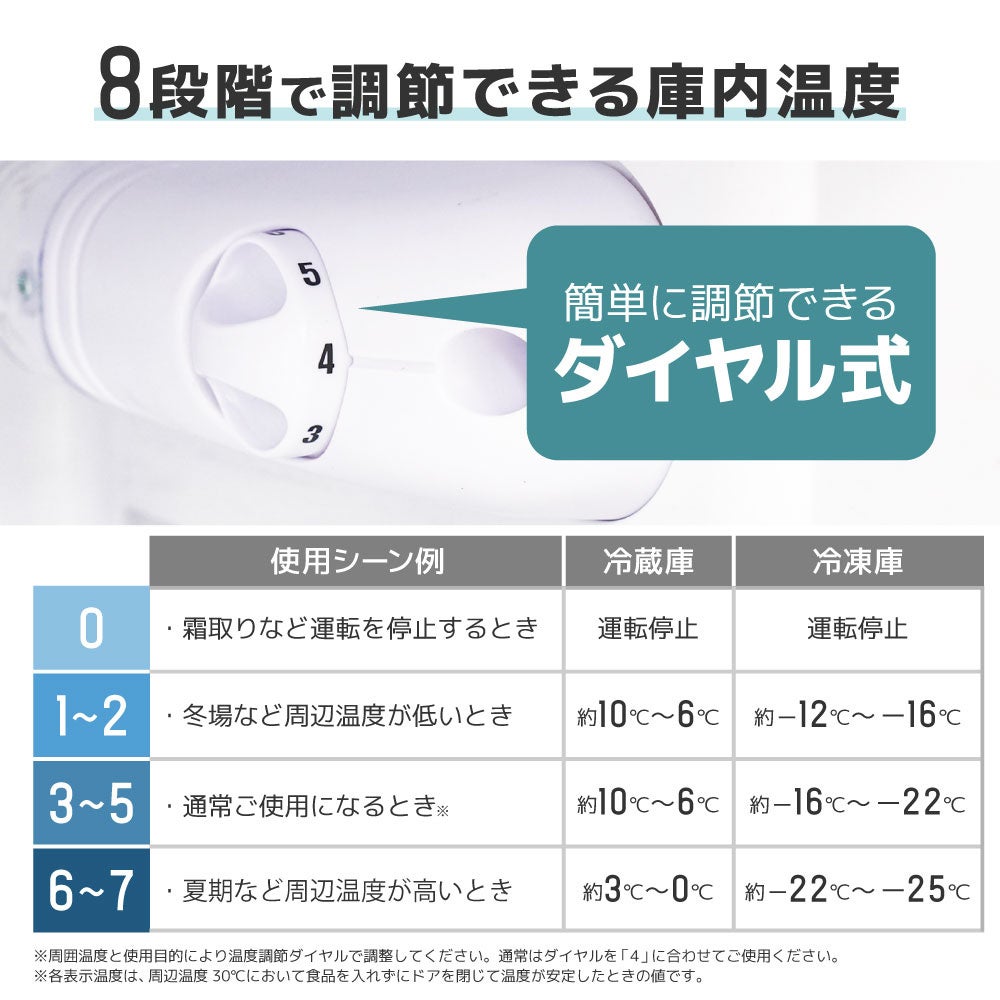 温度調整は冷蔵室内のダイヤルで8段階の設定が可能。季節や周辺温度に応じて調整ができます。