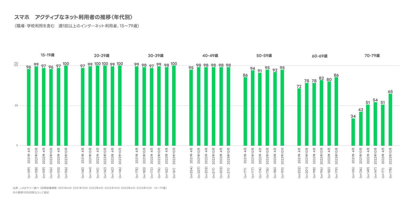 ・60代以上のシニア層においては、「スマホ」でのインターネット利用者の増加傾向が顕著。2023年10月の調査で、60代は86%、70代は65%の利用率となった。