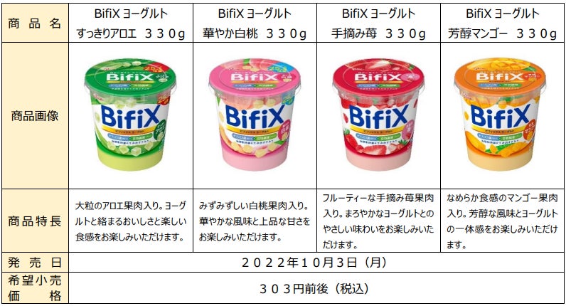 江崎グリコ株式会社は、「BifiXヨーグルト」のフルーツシリーズを一新し、「BifiXヨーグルト すっきりアロエ330g」「BifiXヨーグルト 華やか白桃330g」「BifiXヨーグルト 手摘み苺330g」「BifiXヨーグルト 芳醇マンゴー330g」の4品を、2022年10月3日(月)より全国にて発売します。