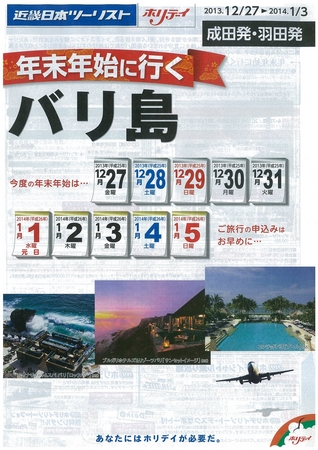2013年12月27日から2014年1月4日までの時期(方面により設定期間が変わります)のご旅行を専用パンフレットにして、お客様にご案内します。