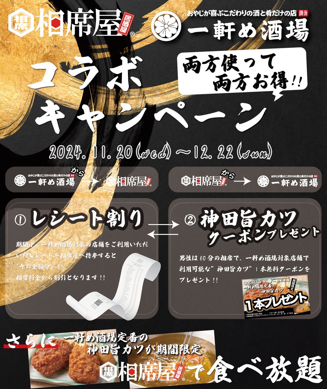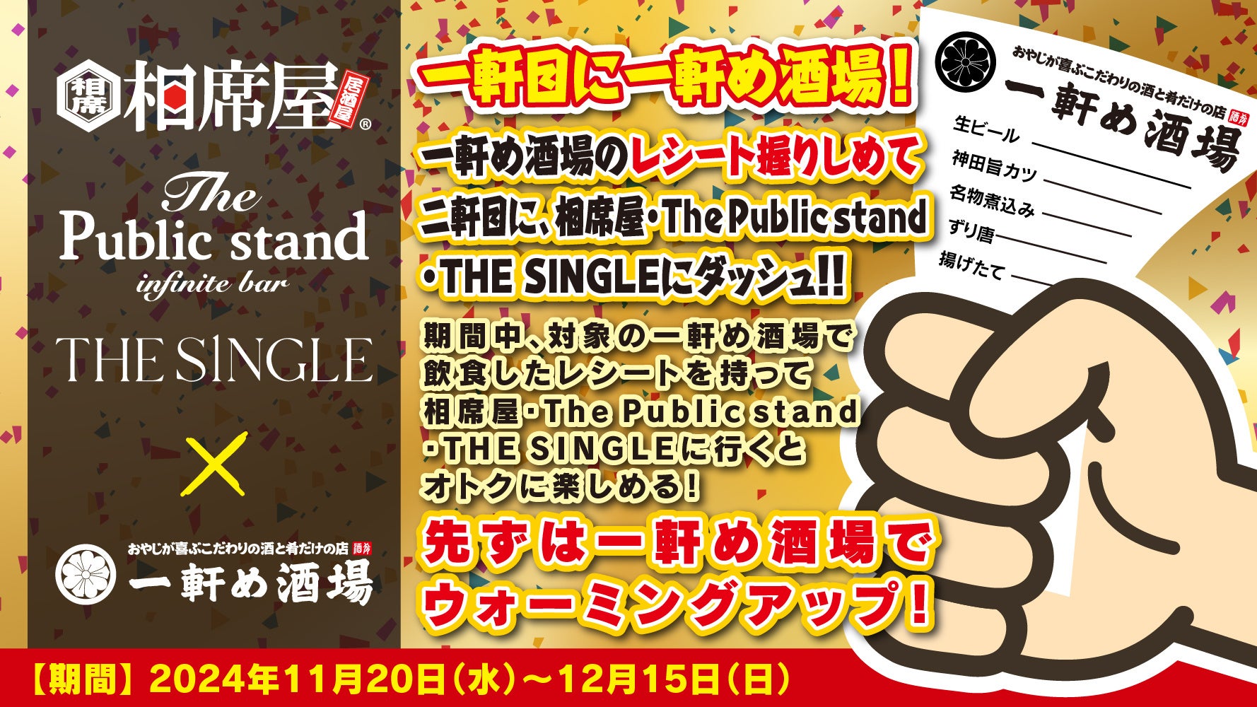 期間中、対象の「一軒め酒場」でご飲食したレシート(2024年11月20日-2024年12月22日までの日付が対象)を持って、対象の「相席屋」、「The Public stand」、「THE SINGLE」の店舗を利用するとオトクに楽しめるキャンペーン開催します。