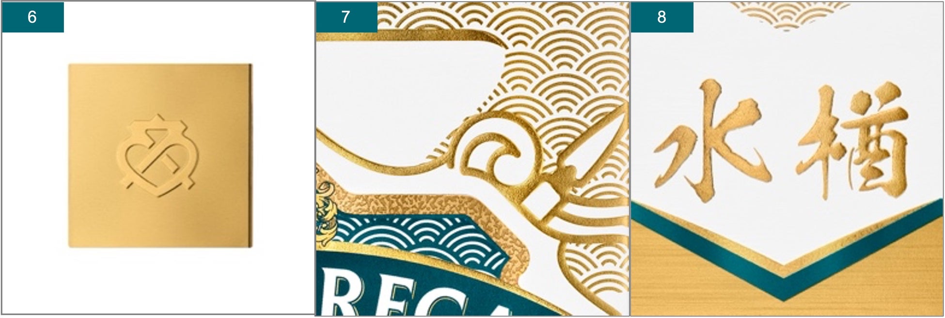 ② ミズナラの木を想起させる青翠色とゴールドの荘厳なコントラストで商品を象徴する青海波を表現。