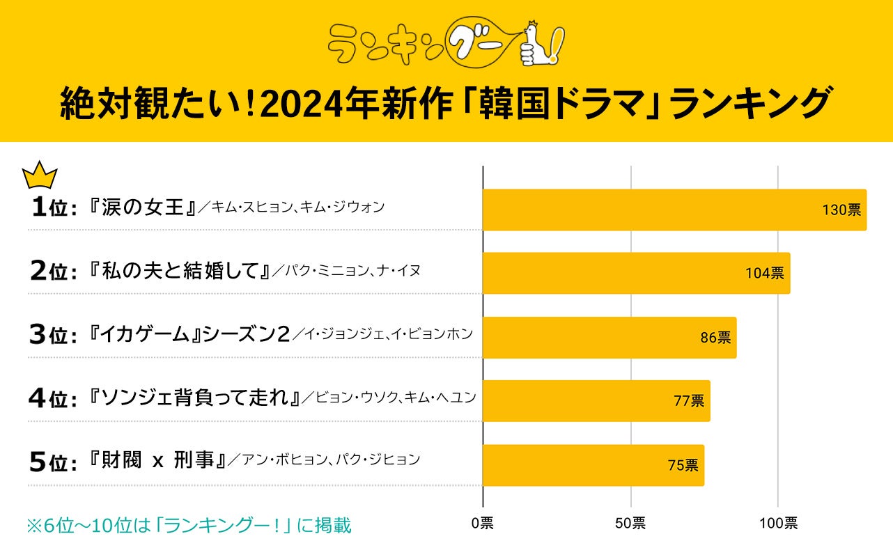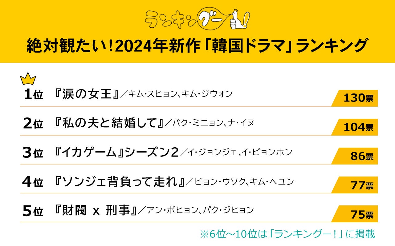 ランキングー!では2024年新作「韓国ドラマ」をピックアップし、ランキングを調査。全年代の女性1,745名にアンケートを行い、同率票を含むTOP10を決定しました。ここではTOP5をご紹介します。