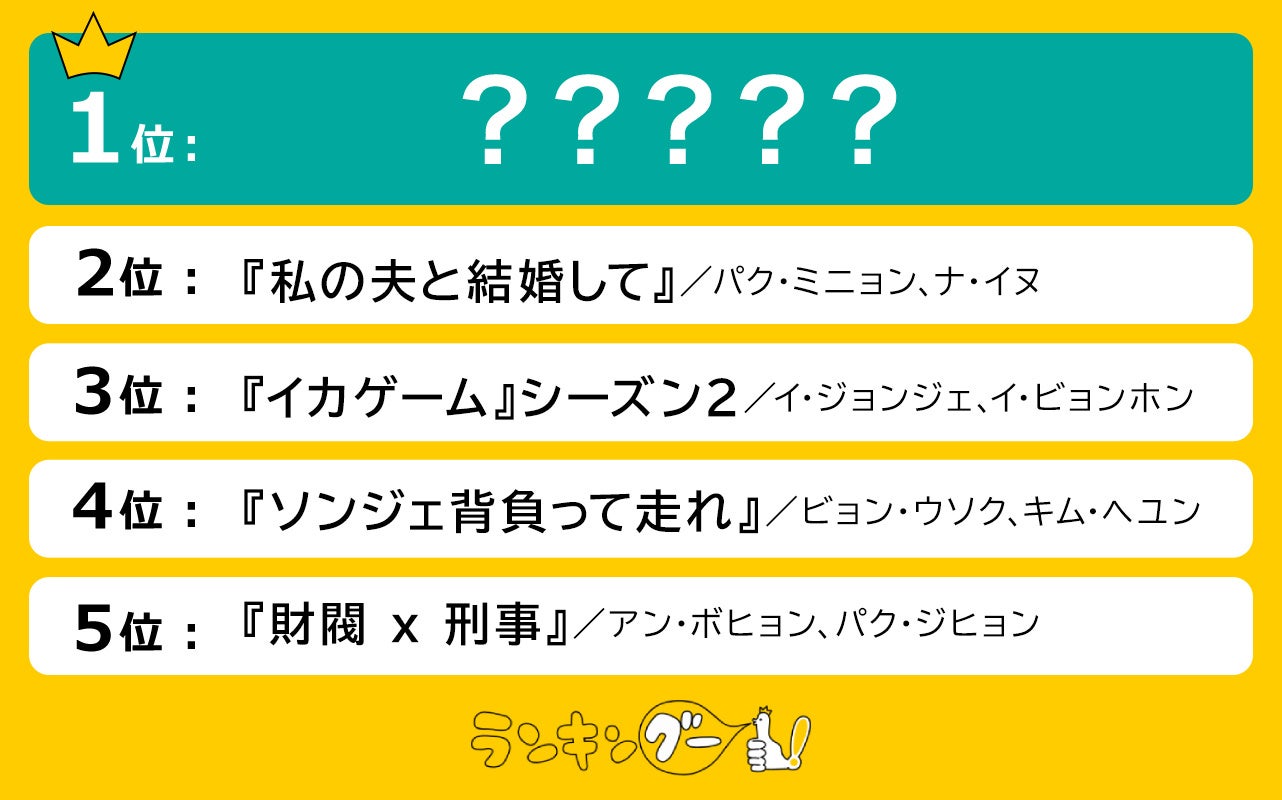 2位はWebマンガを原作とするファンタジー・ロマンス作品の『私の夫と結婚して』。3位は前作を超える新たな展開に期待が高まっている『イカゲーム』シーズン2。4位はタイムリープファンタジー・ロマンスの『ソンジェ背負って走れ』。そして4位と僅か2票差で5位にランクインしたのは、アクションコメディーの『財閥 x 刑事』でした。