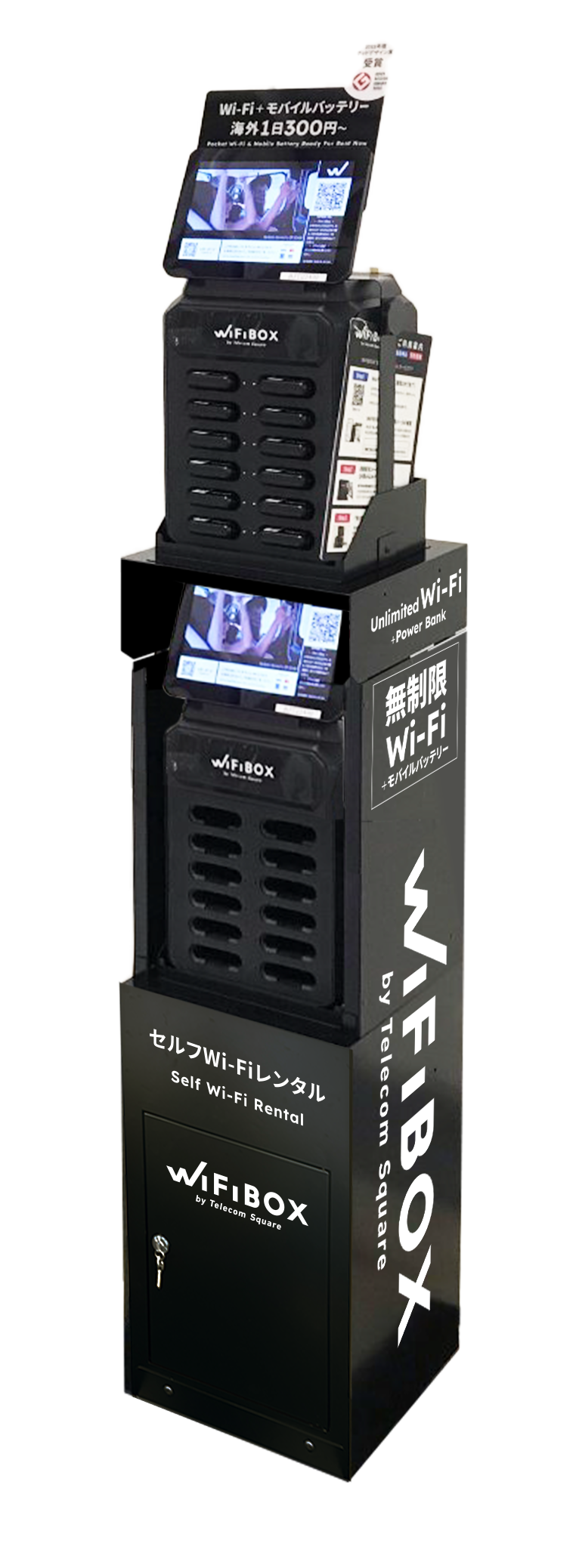 「WiFiBOX」は、当社が2022年4月1日にリリースしたWi-Fiレンタルの新サービスで、事前予約がなくとも即時予約・受取・使用開始が可能なシェアリング型サービスです(特許出願中)。日本国内プランは1日840円(税込価格)で無制限の利用ができるうえ、端末には充電用ケーブルが格納されモバイルバッテリー機能も搭載、スマートフォンの充電を行うことも可能です。コロナ禍での非対面ニーズへの対応やユーザーにとって煩わしい手続き・行列待ちの排除、運営コストの削減、設置場所の余剰スペース確保など多方面での複合的効果をもたらすサービスデザインが高く評価されたことから、2022年度グッドデザイン賞を受賞いたしました。