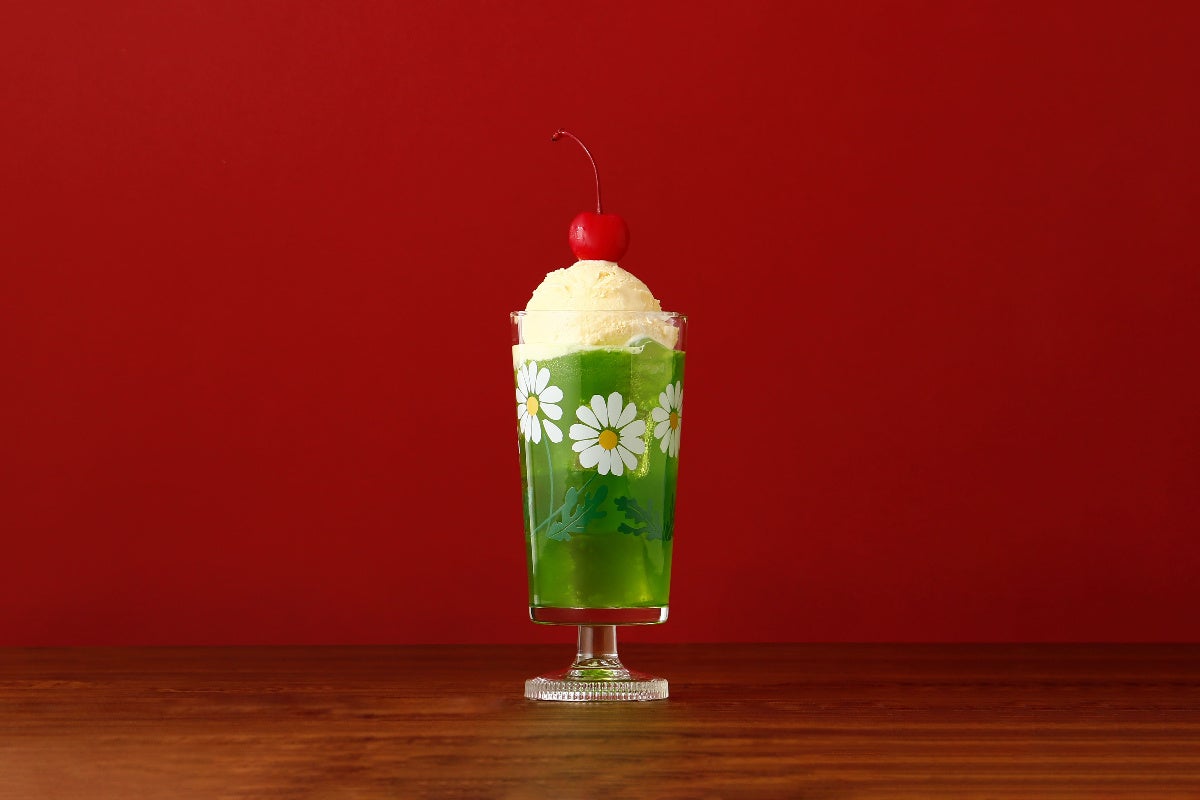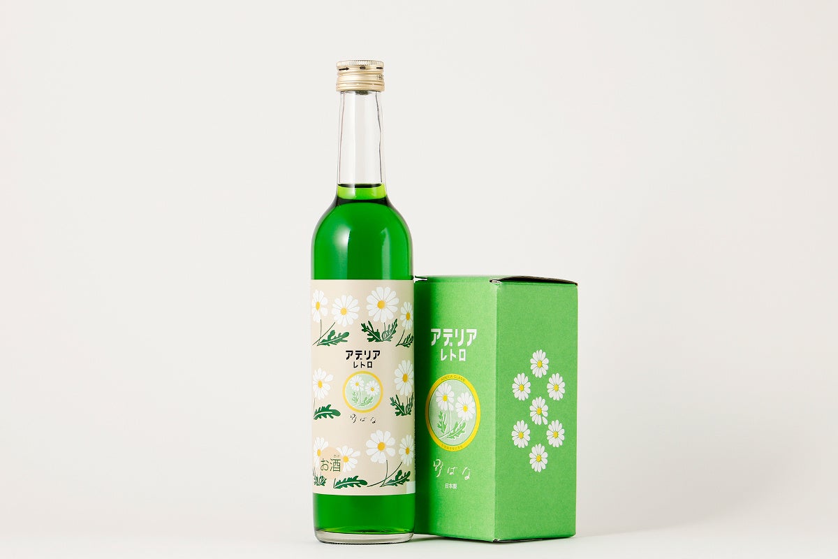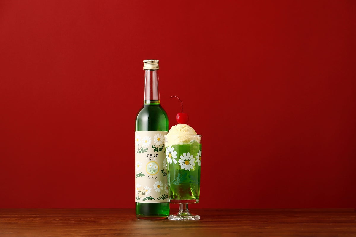今回は、レトロ喫茶の代表格である「メロンクリームソーダ」のお酒が入ったボトルに、やわらかなタッチで描かれた「野ばな」のデザインをあしらいました。「アデリアレトロ コラボ レトロ喫茶シリーズ - 野ばな -」をご購入いただいた方には、同じ「野ばな」が描かれた脚付きグラスをセットでお届けします。炭酸水で割るだけで、誰でも簡単にメロンクリームソーダが作れるので、おうちでレトロ喫茶気分をお楽しみいただけます。