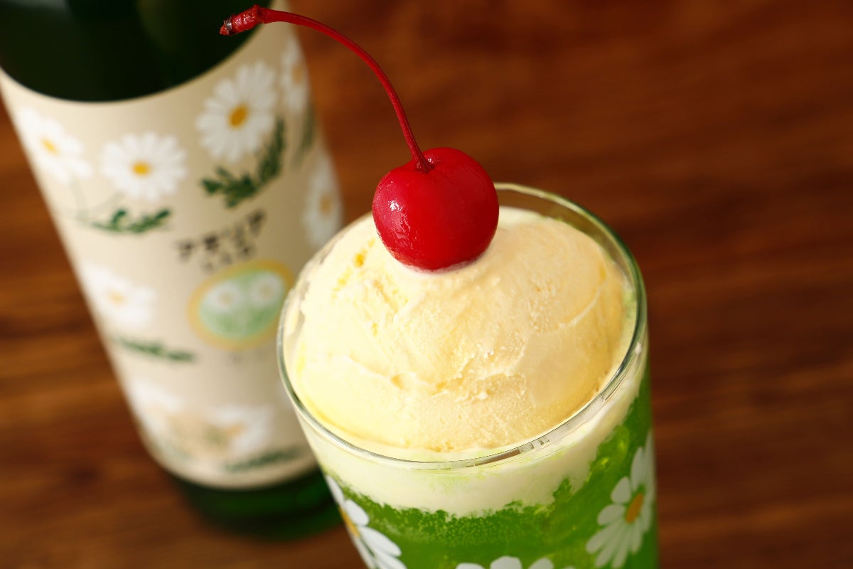 レトロ喫茶の代表格「メロンクリームソーダ」のお酒です。お酒と炭酸水を1:2の割合で注いでお楽しみください。アイスクリームとお好みでさくらんぼを添えれば、よりおうちでレトロ喫茶気分を味わえます。