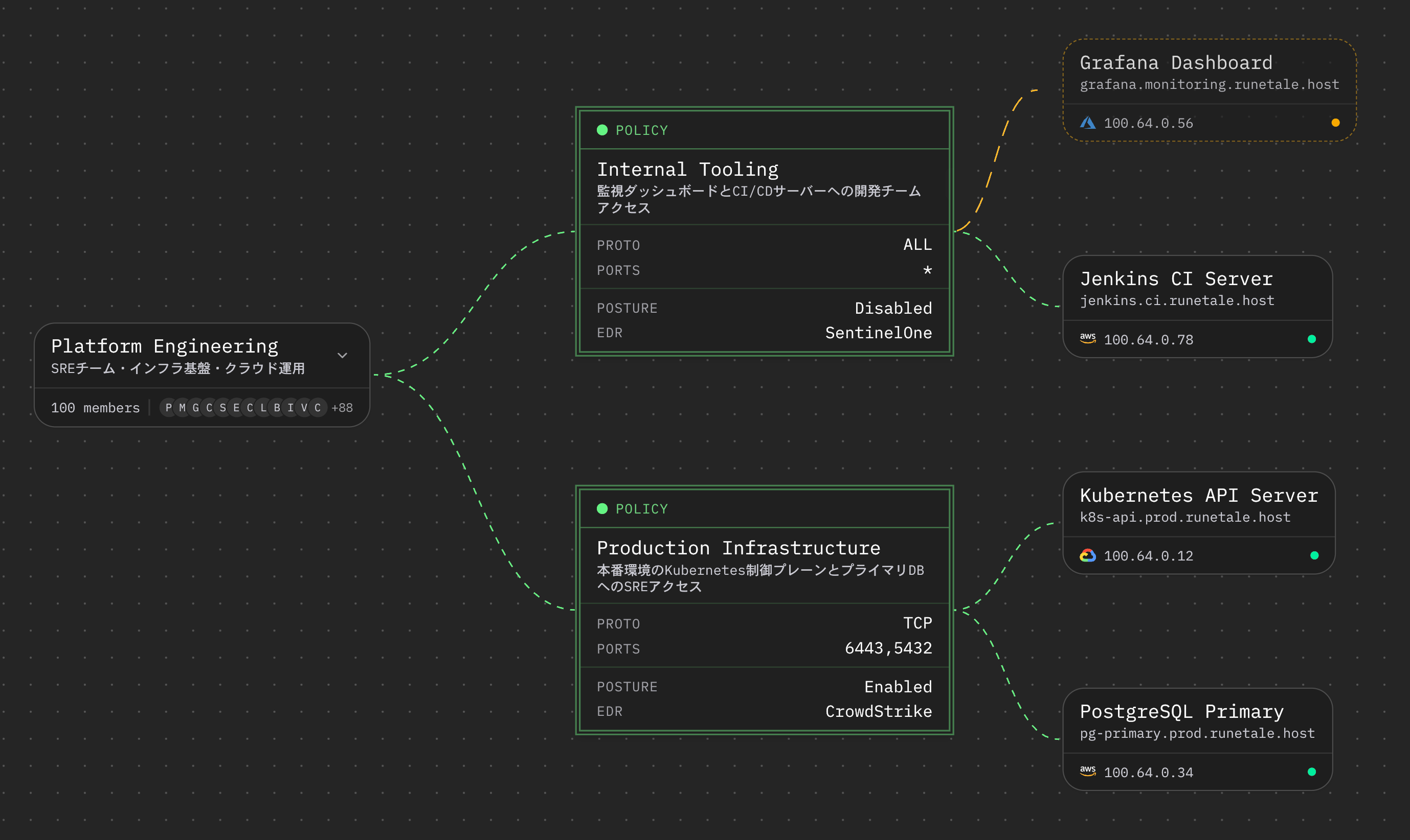 こうした課題に対してHENNGEは投資先であるRunetale社と連携し、同社の技術を活用してHENNGE Mesh Networkのサービスを開発。企業内ネットワークという「場所で守る」ことから、「誰(アイデンティティ)であるかで許可する」というゼロトラストの現実解を提供することにしました。認証されたユーザーの端末のみが必要なリソースへ接続できるメッシュ型のネットワーク環境を実現します。ルーターの複雑な設定や高価なシステムインテグレーションも不要です。