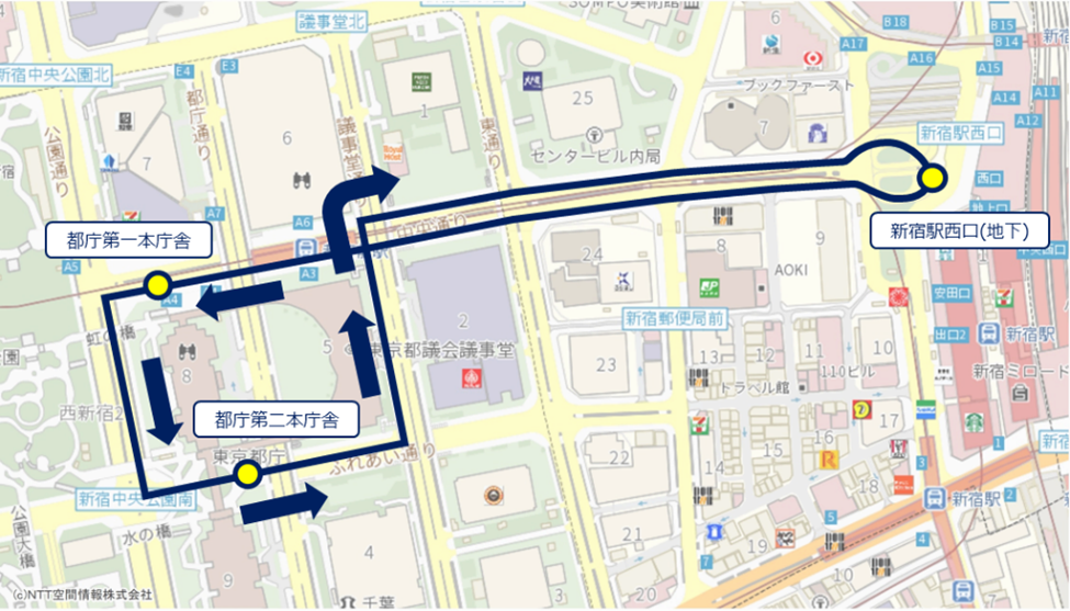 - 運行区間:運行経路および使用バス停(都庁循環(C・H01)と同一経路)新宿駅西口(地下)~都庁第一本庁舎~都庁第二本庁舎~新宿駅西口 ※都議会議事堂は停車しません。