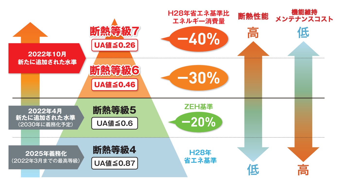 東北6県の商圏をカバーするにあたって、キーワードとなるのは「省エネ」と「断熱性能」。建築基準法が4月1日に改正されたことにより、省エネ基準が厳格化されました。住宅の断熱等級4が義務化され、2030年以降はすべての新築に断熱等級5の適合が義務付けられます。特に寒冷地域が範囲となる東北エリアは、東京などと地域区分が違っており、より厳しい条件をクリアしないと高い断熱等級を取得することができません。