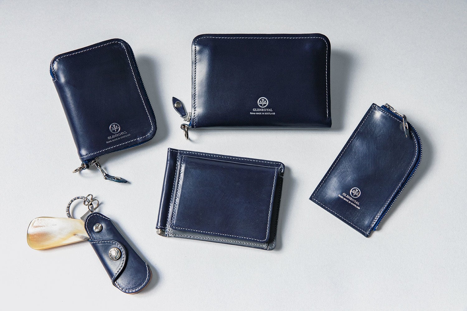 京都店限定の革小物も、ダークブルーとグレーのバイカラーで統一しました。ベースカラーのダークブルーにグレーのステッチの組み合わせは非常にシックです。刻印、スタッズ、金具もすべてシルバーにこだわり、スタイリッシュに仕上げられています。マネークリップに使われているクリップも通常はゴールドカラーですが、京都店限定品には珍しいシルバーカラーのものを使用しています。