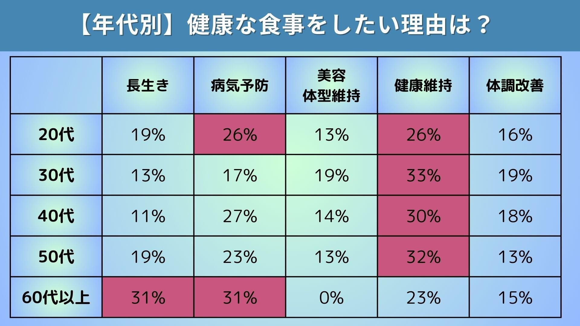 【年代別】健康的な食事をしたい理由「20〜50代は健康維持」「60代以降は長生き・病気予防」