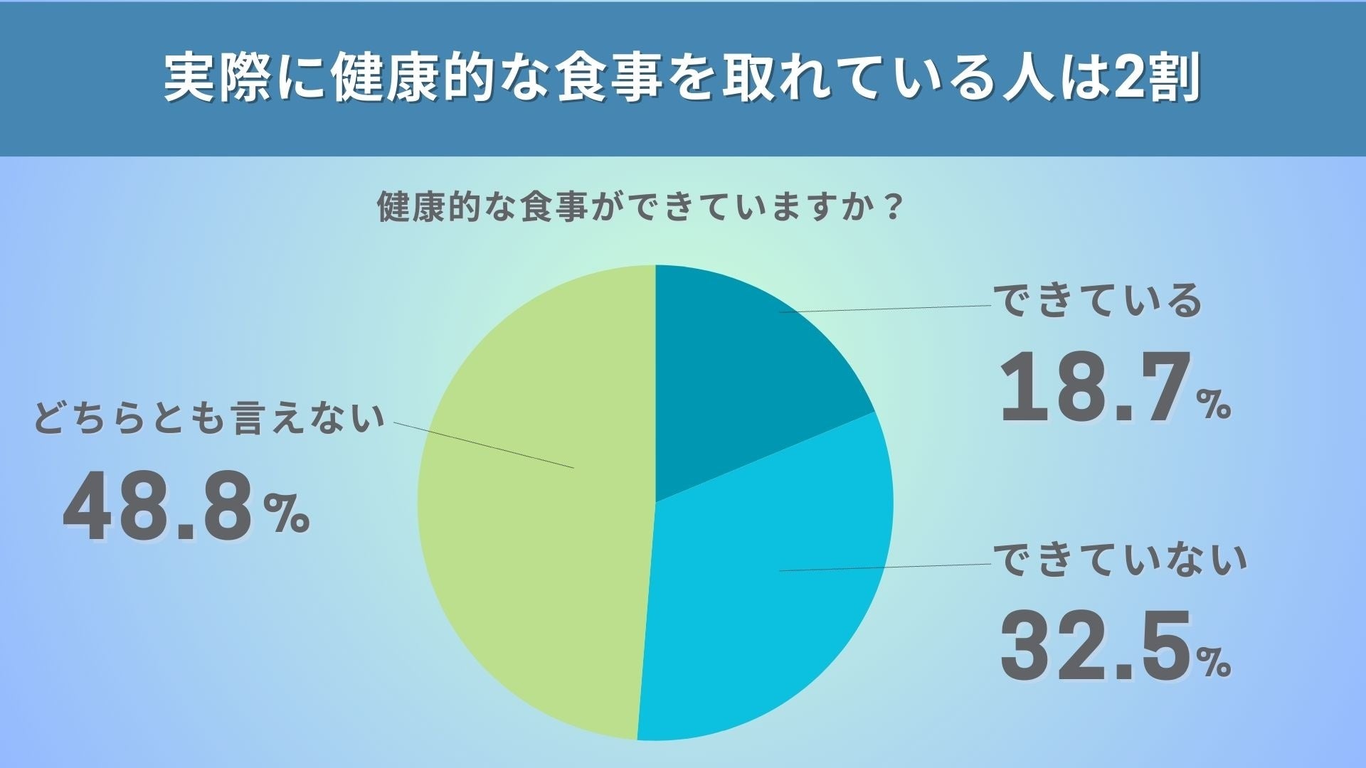 健康的な食事ができているかどうかについての調査結果では、「できている」が18.7%、「できていない」が32.5%、「どちらとも言えない」が48.8%となっています。