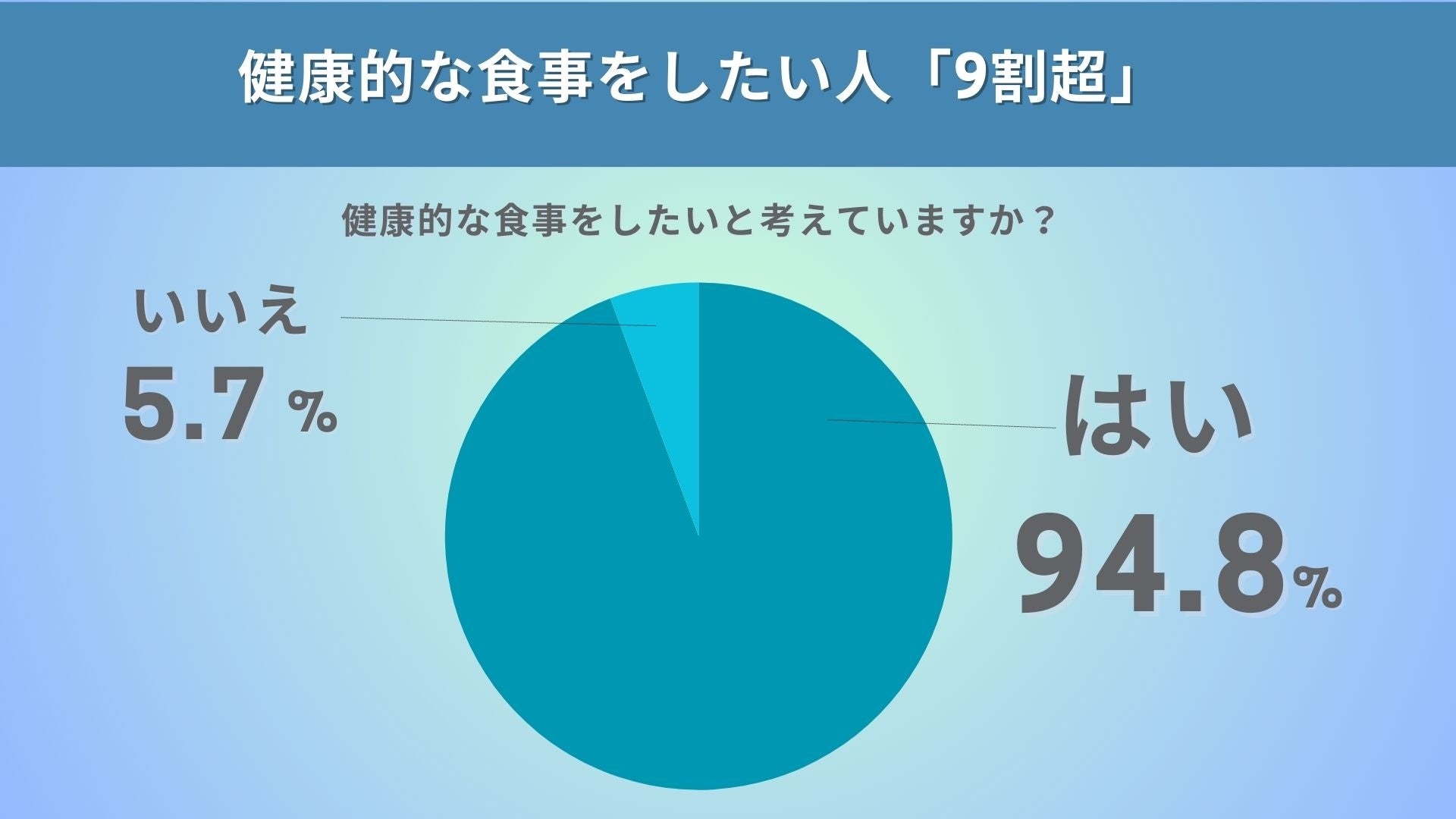 健康的な食事をしたいと考える人が94.8%に上るという結果となっています。多くの人々が健康に対する意識を高く持っており、健康的な食事の重要性が広く認識されていることが挙げられます。健康志向が社会的なトレンドとなっていることもあり、周囲の影響や社会的な流れに乗って健康的な生活を目指す人が増えている傾向が伺えます。