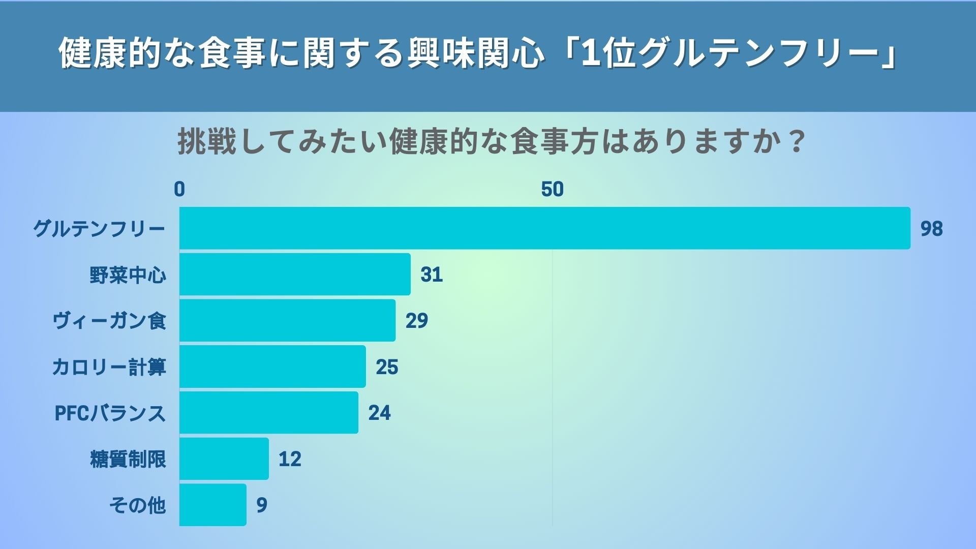 現在のトレンドとして、グルテンフリーが最も関心を集めていることが分かります。グルテンフリーの食事法は、身体の軽さやだるさの軽減、消化の改善などの健康効果が期待されており、多くの人々が試してみたいと考えています。